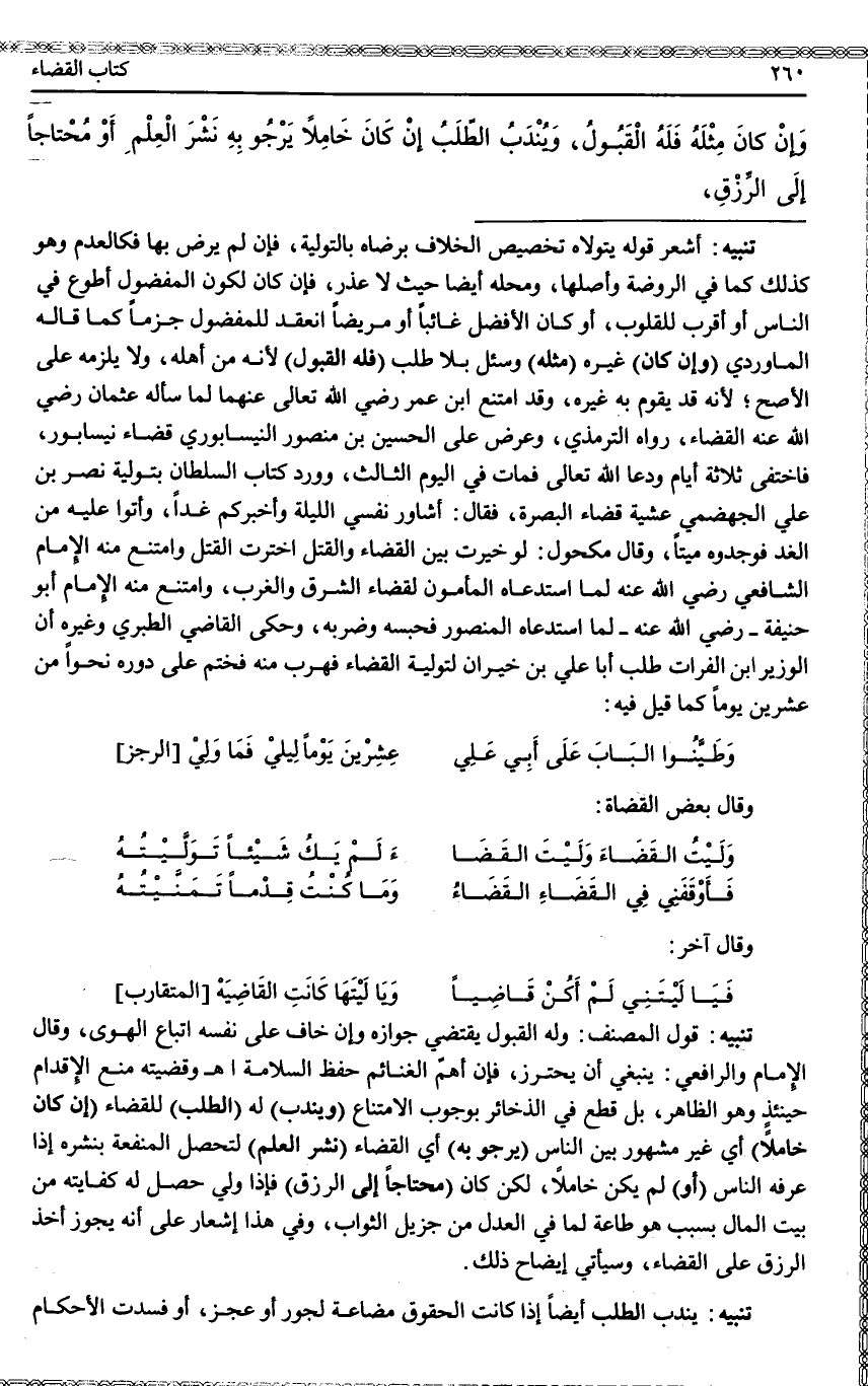 (وَيُنْدَبُ) لَهُ (الطَّلَبُ) لِلْقَضَاءِ (إنْ كَانَ خَامِلًا) أَيْ غَيْرَ مَشْهُورٍ بَيْنَ النَّاسِ (يَرْجُو بِهِ) أَيْ الْقَضَاءِ (نَشْرَ الْعِلْمِ) لِتَحْصُلَ الْمَنْفَعَةُ بِنَشْرِهِ إذَا عَرَفَهُ النَّاسُ (أَوْ) لَمْ يَكُنْ خَامِلًا، لَكِنْ كَانَ (مُحْتَاجًا إلَى الرِّزْقِ) فَإِذَا وُلِّيَ حَصَلَ لَهُ كِفَايَتُهُ مِنْ بَيْتِ الْمَالِ بِسَبَبٍ هُوَ طَاعَةٌ لِمَا فِي الْعَدْلِ مِنْ جَزِيلِ الثَّوَابِ، وَفِي هَذَا إشْعَارٌ عَلَى أَنَّهُ يَجُوزُ أَخْذُ الرِّزْقِ عَلَى الْقَضَاءِ، وَسَيَأْتِي إيضَاحُ ذَلِكَ.