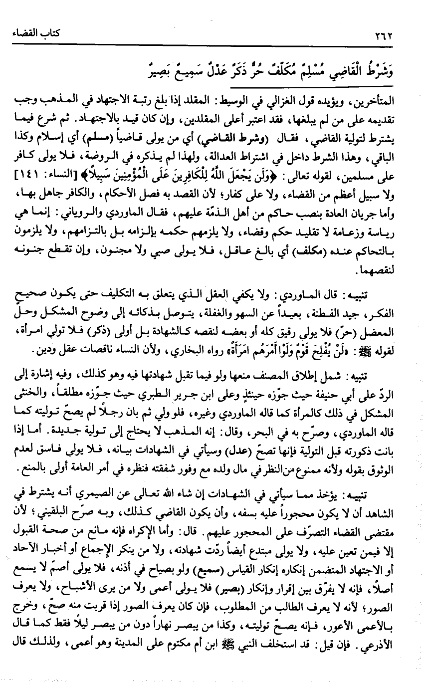 وَشَرْطُ الْقَاضِي مُسْلِمٌ مُكَلَّفٌ حُرٌّ ذَكَرٌ عَدْلٌ سَمِيعٌ بَصِيرٌ