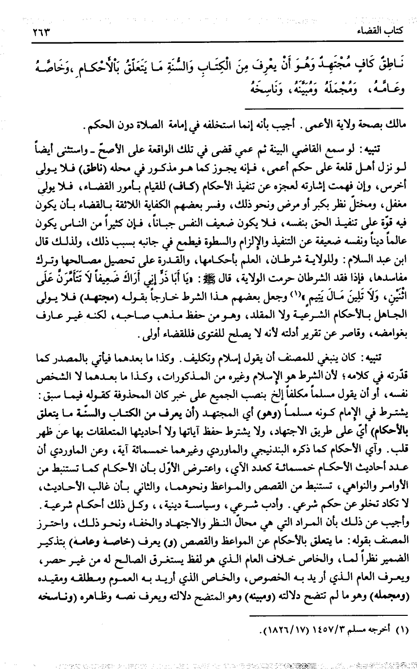 نَاطِقٌ كَافٍ مُجْتَهِدٌ وَهُوَ أَنْ يَعْرِفَ مِنْ الْكِتَابِ وَالسُّنَّةِ مَا يَتَعَلَّقُ بِالْأَحْكَامِ، وَخَاصَّهُ وَعَامَّهُ، وَمُجْمَلَهُ وَمُبَيَّنَهُ، وَنَاسِخَهُ
