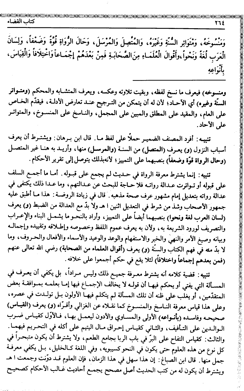 وَمَنْسُوخَهُ، وَمُتَوَاتِرَ السُّنَّةِ وَغَيْرَهُ، وَالْمُتَّصِلَ وَالْمُرْسَلَ، وَحَالَ الرُّوَاةِ قُوَّةً وَضَعْفًا، وَلِسَانَ الْعَرَبِ لُغَةً وَنَحْوًا، وَأَقْوَالَ الْعُلَمَاءِ مِنْ الصَّحَابَةِ فَمَنْ بَعْدَهُمْ إجْمَاعًا وَاخْتِلَافًا وَالْقِيَاسَ، بِأَنْوَاعِهِ