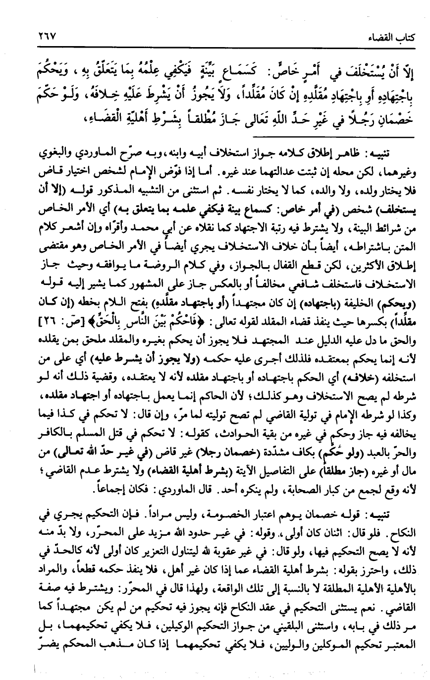 ـــــــــــــــــــــــــــــQتَنْبِيهٌ: ظَاهِرُ إطْلَاقِ كَلَامِهِ جَوَازُ اسْتِخْلَافِ أَبِيهِ وَابْنِهِ، وَبِهِ صَرَّحَ الْمَاوَرْدِيُّ وَالْبَغَوِيُّ وَغَيْرُهُمَا، لَكِنَّ مَحَلَّهُ إنْ ثَبَتَتْ عَدَالَتُهُمَا عِنْدَ غَيْرِهِ. أَمَّا إذَا فَوَّضَ الْإِمَامُ لِشَخْصٍ اخْتِيَارَ قَاضٍ فَلَا يَخْتَارُ وَلَدَهُ وَلَا وَالِدَهُ، كَمَا لَا يَخْتَارُ نَفْسَهُ. ثُمَّ اسْتَثْنَى مِنْ التَّشْبِيهِ الْمَذْكُورِ قَوْلَهُ (إلَّا أَنْ يُسْتَخْلَفَ) شَخْصٌ (فِي أَمْرٍ خَاصٍّ: كَسَمَاعِ بَيِّنَةٍ فَيَكْفِي عِلْمُهُ بِمَا يَتَعَلَّقُ بِهِ) أَيْ الْأَمْرِ الْخَاصِّ مِنْ شَرَائِطِ الْبَيِّنَةِ، وَلَا يُشْتَرَطُ فِيهِ رُتْبَةُ الِاجْتِهَادِ كَمَا نَقَلَاهُ عَنْ أَبِي مُحَمَّدٍ وَأَقَرَّاهُ وَإِنْ أَشْعَرَ كَلَامُ الْمَتْنِ بِاشْتِرَاطِهِ، أَيْضًا بِأَنَّ خِلَافَ الِاسْتِخْلَافِ يَجْرِي أَيْضًا فِي الْأَمْرِ الْخَاصِّ وَهُوَ مُقْتَضَى إطْلَاقِ الْأَكْثَرِينَ، لَكِنْ قَطَعَ الْقَفَّالُ بِالْجَوَازِ، وَفِي كَلَامِ الرَّوْضَةِ مَا يُوَافِقُهُ وَحَيْثُ جَازَ الِاسْتِخْلَافُ فَاسْتَخْلَفَ شَافِعِيٌّ مُخَالِفًا أَوْ بِالْعَكْسِ جَازَ عَلَى الْمَشْهُورِ كَمَا يُشِيرُ إلَيْهِ قَوْلُهُ (وَيَحْكُمَ) الْخَلِيفَةُ (بِاجْتِهَادِهِ) إنْ كَانَ مُجْتَهِدًا (أَوْ بِاجْتِهَادِ مُقَلَّدِهِ) بِفَتْحِ اللَّام بِخَطِّهِ (إنْ كَانَ مُقَلِّدًا) بِكَسْرِهَا حَيْثُ يَنْفُذُ قَضَاءُ الْمُقَلِّدِ لِقَوْلِهِ تَعَالَى: {فَاحْكُمْ بَيْنَ النَّاسِ بِالْحَقِّ} [ص: 26] وَالْحَقُّ مَا دَلَّ عَلَيْهِ الدَّلِيلُ عِنْدَ الْمُجْتَهِدِ فَلَا يَجُوزُ أَنْ يَحْكُمَ بِغَيْرِهِ وَالْمُقَلِّدُ مُلْحَقٌ بِمَنْ يُقَلِّدُهُ لِأَنَّهُ إنَّمَا يَحْكُمُ بِمُعْتَقِدِهِ فَلِذَلِكَ أَجْرَى عَلَيْهِ حُكْمَهُ (وَلَا يَجُوزُ أَنْ يَشْرِطَ عَلَيْهِ) أَيْ عَلَى مَنْ اسْتَخْلَفَهُ (خِلَافَهُ) أَيْ الْحُكْمِ بِاجْتِهَادِهِ أَوْ بِاجْتِهَادِ مُقَلَّدِهِ لِأَنَّهُ لَا يَعْتَقِدُهُ، وَقَضِيَّةُ ذَلِكَ أَنَّهُ لَوْ شَرَطَهُ لَمْ يَصِحَّ الِاسْتِخْلَافُ وَهُوَ كَذَلِكَ؛ لِأَنَّ الْحَاكِمَ إنَّمَا يَعْمَلُ بِاجْتِهَادِهِ أَوْ اجْتِهَادِ مُقَلَّدِهِ، وَكَذَا لَوْ شَرَطَهُ الْإِمَامُ فِي تَوْلِيَةِ الْقَاضِي لَمْ تَصِحَّ تَوْلِيَتُهُ لِمَا مَرَّ، وَإِنْ قَالَ: لَا تَحْكُمْ فِي كَذَا فِيمَا يُخَالِفُهُ فِيهِ جَازَ وَحَكَمَ فِي غَيْرِهِ مِنْ بَقِيَّةِ الْحَوَادِثِ، كَقَوْلِهِ: لَا تَحْكُمْ فِي قَتْلِ الْمُسْلِمِ بِالْكَافِرِ وَالْحُرِّ بِالْعَبْدِ.