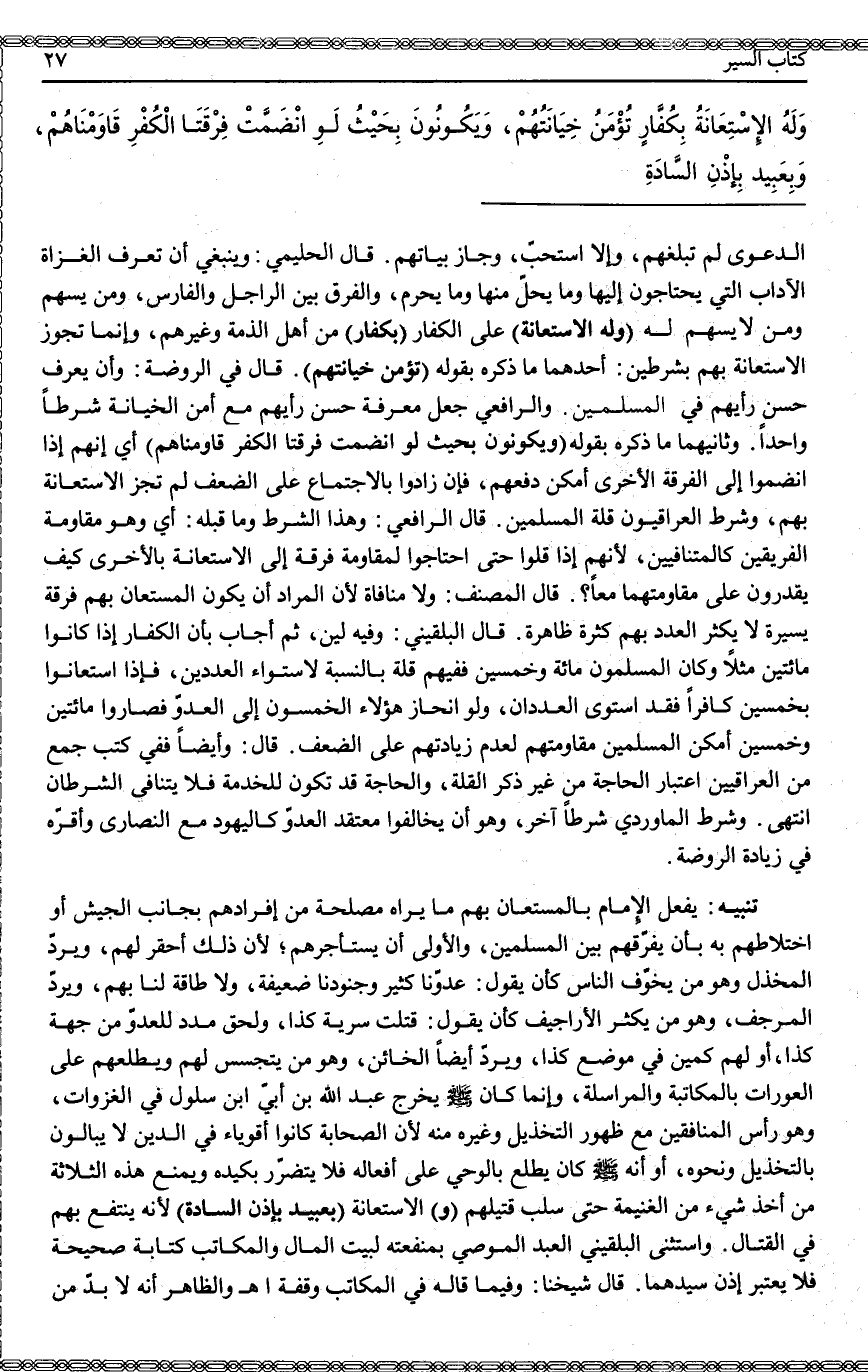 (وَلَهُ الِاسْتِعَانَةُ) عَلَى الْكُفَّارِ (بِكُفَّارٍ) مِنْ أَهْلِ الذِّمَّةِ وَغَيْرِهِمْ، وَإِنَّمَا تَجُوزُ الِاسْتِعَانَةُ بِهِمْ بِشَرْطَيْنِ: أَحَدُهُمَا مَا ذَكَرَهُ بِقَوْلِهِ (تُؤْمَنُ خِيَانَتُهُمْ) . قَالَ: فِي الرَّوْضَةِ: وَأَنْ يُعْرَفَ حُسْنُ رَأْيِهِمْ فِي الْمُسْلِمِينَ. وَالرَّافِعِيُّ جَعَلَ مَعْرِفَةَ حُسْنِ رَأْيِهِمْ مَعَ أَمْنِ الْخِيَانَةِ شَرْطًا وَاحِدًا. وَثَانِيهمَا مَا ذَكَرَهُ بِقَوْلِهِ (وَيَكُونُونَ بِحَيْثُ لَوْ انْضَمَّتْ فِرْقَتَا الْكُفْرِ قَاوَمْنَاهُمْ) أَيْ إنَّهُمْ إذَا انْضَمُّوا إلَى الْفِرْقَةِ الْأُخْرَى أَمْكَنَ دَفْعُهُمْ، فَإِنْ زَادُوا بِالِاجْتِمَاعِ عَلَى الضِّعْفِ لَمْ تَجُزْ الِاسْتِعَانَةُ بِهِمْ، وَشَرَطَ الْعِرَاقِيُّونَ قِلَّةَ الْمُسْلِمِينَ. قَالَ: الرَّافِعِيُّ: وَهَذَا الشَّرْطُ وَمَا قَبْلَهُ: أَيْ هُوَ مُقَاوَمَةِ الْفَرِيقَيْنِ كَالْمُتَنَافِيَيْنِ؛ لِأَنَّهُمْ إذَا قَلُّوا حَتَّى احْتَاجُوا لِمُقَاوَمَةِ فِرْقَةٍ إلَى الِاسْتِعَانَةِ بِالْأُخْرَى كَيْفَ يَقْدِرُونَ عَلَى مُقَاوَمَتِهِمَا مَعًا؟ قَالَ الْمُصَنِّفُ: وَلَا مُنَافَاةَ؛ لِأَنَّ الْمُرَادَ أَنْ يَكُونَ الْمُسْتَعَانُ بِهِمْ فِرْقَةً يَسِيرَةً لَا يَكْثُرُ الْعَدَدُ بِهِمْ كَثْرَةً ظَاهِرَةً. قَالَ: الْبُلْقِينِيُّ: وَفِيهِ لِينٌ.