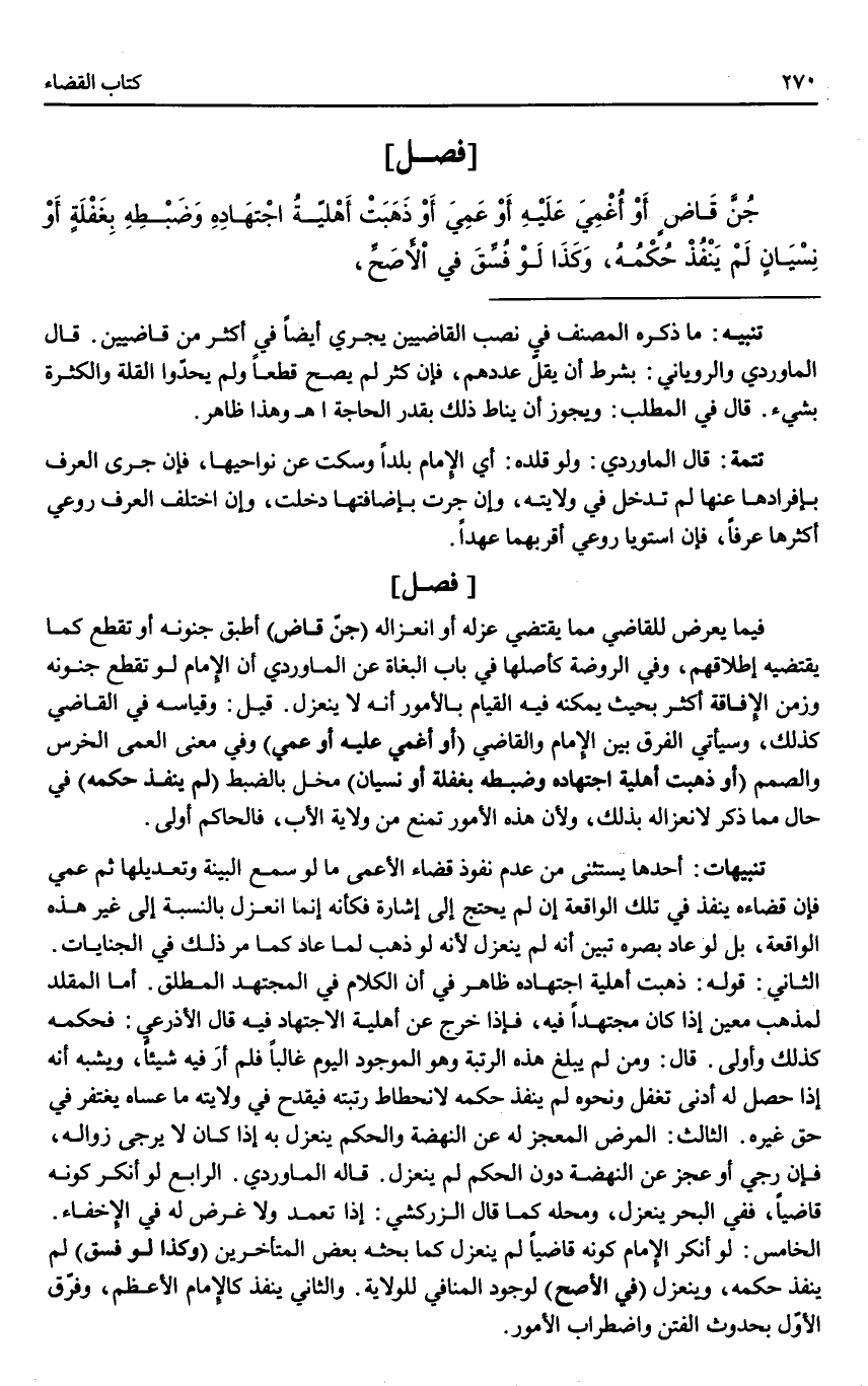 [فَصْلٌ] فِيمَا يَعْرِضُ لِلْقَاضِي مِمَّا يَقْتَضِي عَزْلَهُ أَوْ انْعِزَالَهُ (جُنَّ قَاضٍ) أَطْبَقَ جُنُونُهُ أَوْ تَقَطَّعَ كَمَا يَقْتَضِيه إطْلَاقُهُمْ، وَفِي الرَّوْضَةِ كَأَصْلِهَا فِي بَابِ الْبُغَاةِ عَنْ الْمَاوَرْدِيُّ أَنَّ الْإِمَامَ لَوْ تَقَطَّعَ جُنُونُهُ وَزَمَنُ الْإِفَاقَةِ أَكْثَرُ بِحَيْثُ يُمْكِنُهُ فِيهِ الْقِيَامُ بِالْأُمُورِ أَنَّهُ لَا يَنْعَزِلُ. قِيلَ: وَقِيَاسُهُ فِي الْقَاضِي كَذَلِكَ، وَسَيَأْتِي الْفَرْقُ بَيْنَ الْإِمَامِ وَالْقَاضِي (أَوْ أُغْمِيَ عَلَيْهِ أَوْ عَمِيَ) وَفِي مَعْنَى الْعَمَى الْخَرَسُ وَالصَّمَمُ (أَوْ ذَهَبَتْ أَهْلِيَّةُ اجْتِهَادِهِ وَضَبْطِهِ بِغَفْلَةٍ أَوْ نِسْيَانٍ) مُخِلٍّ بِالضَّبْطِ (لَمْ يَنْفُذْ حُكْمُهُ) فِي حَالٍ مِمَّا ذُكِرَ لِانْعِزَالِهِ بِذَلِكَ، وَلِأَنَّ هَذِهِ الْأُمُورَ تَمْنَعُ مِنْ وِلَايَةِ الْأَبِ، فَالْحَاكِمُ أَوْلَى.
