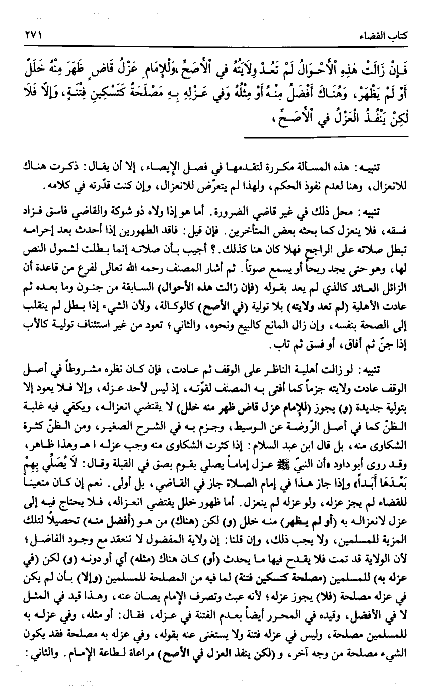 تَنْبِيهٌ مَحِلُّ ذَلِكَ فِي غَيْرِ قَاضِي الضَّرُورَةِ. أَمَّا هُوَ إذَا وَلَّاهُ ذُو شَوْكَةٍ وَالْقَاضِي فَاسِقٌ فَزَادَ فِسْقُهُ، فَلَا يَنْعَزِلُ كَمَا بَحَثَهُ بَعْضُ الْمُتَأَخِّرِينَ. فَإِنْ قِيلَ: فَاقِدُ الطَّهُورَيْنِ إذَا أَحْدَثَ بَعْدَ إحْرَامِهِ تَبْطُلُ صَلَاتُهُ عَلَى الرَّاجِحِ فَهَلَّا كَانَ هُنَا كَذَلِكَ؟ .