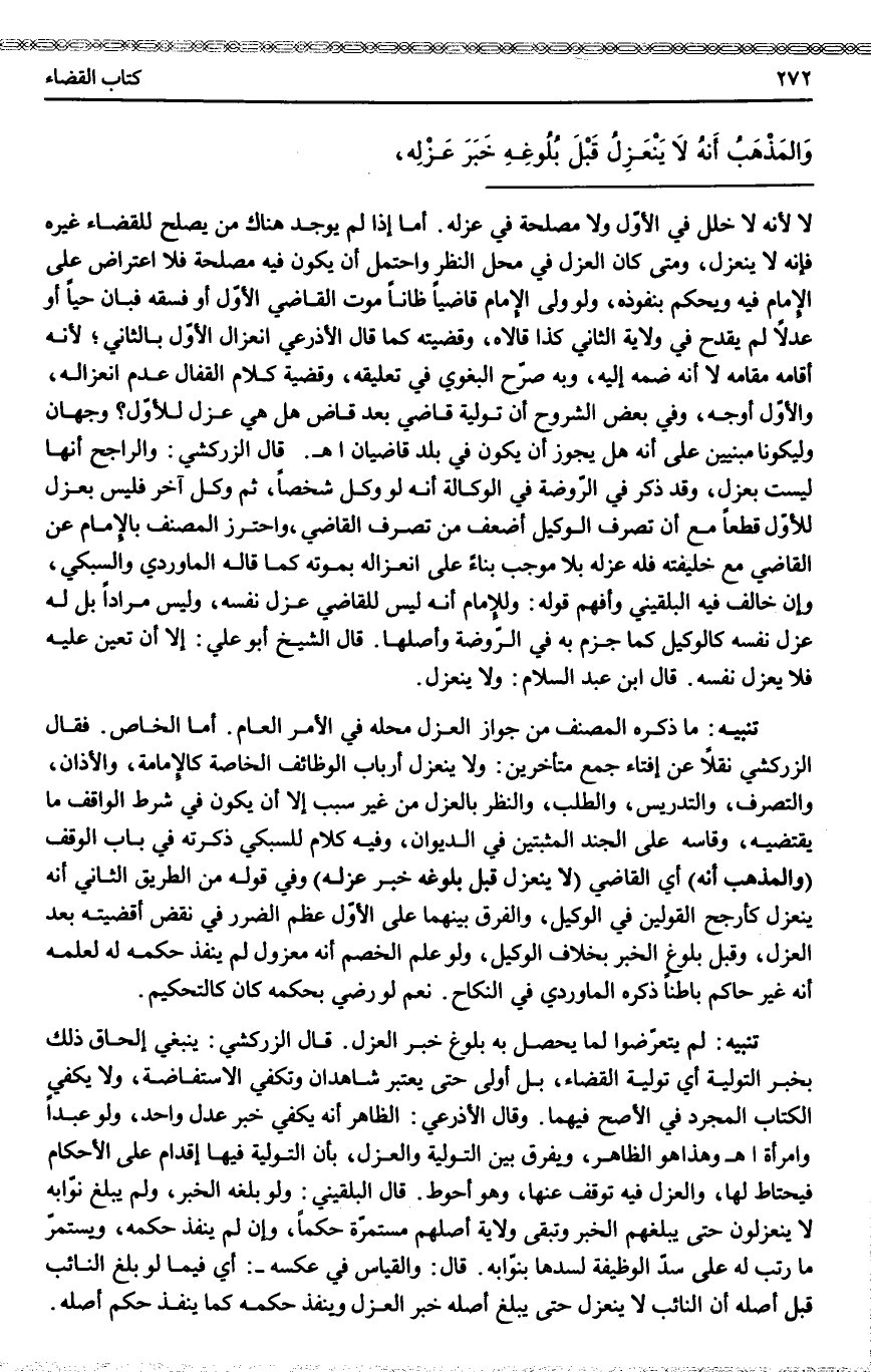تَنْبِيهٌ مَا ذَكَرَهُ الْمُصَنِّفُ مِنْ جَوَازِ الْعَزْلِ مَحِلُّهُ فِي الْأَمْرِ الْعَامِّ. أَمَّا الْخَاصُّ. فَقَالَ الزَّرْكَشِيُّ نَقْلًا عَنْ إفْتَاءِ جَمْعٍ مُتَأَخِّرِينَ: وَلَا يَنْعَزِلُ أَرْبَابُ الْوَظَائِفِ الْخَاصَّةِ كَالْإِمَامَةِ، وَالْأَذَانِ، وَالتَّصَرُّفِ، وَالتَّدْرِيسِ، وَالطَّلَبِ، وَالنَّظَرِ بِالْعَزْلِ مِنْ غَيْرِ سَبَبٍ إلَّا أَنْ يَكُونَ فِي شَرْطِ الْوَاقِفِ مَا يَقْتَضِيهِ، وَقَاسَهُ عَلَى الْجُنْدِ الْمُثْبَتِينَ فِي الدِّيوَانِ، وَفِيهِ كَلَامٌ لِلسُّبْكِيِّ ذَكَرْتُهُ فِي بَابِ الْوَقْفِ (وَالْمَذْهَبُ أَنَّهُ) أَيْ الْقَاضِيَ (لَا يَنْعَزِلُ قَبْلَ بُلُوغِهِ خَبَرَ عَزْلِهِ) وَفِي قَوْلِهِ مِنْ الطَّرِيقِ الثَّانِي أَنَّهُ يَنْعَزِلُ كَأَرْجَحِ الْقَوْلَيْنِ فِي الْوَكِيلِ، وَالْفَرْقُ بَيْنَهُمَا عَلَى الْأَوَّلِ عِظَمُ الضَّرَرِ فِي نَقْضِ أَقْضِيَتِهِ بَعْدَ الْعَزْلِ، وَقَبْلَ بُلُوغِ الْخَبَرِ بِخِلَافِ الْوَكِيلِ، وَلَوْ عَلِمَ الْخَصْمُ أَنَّهُ مَعْزُولٌ لَمْ يُنَفِّذْ حُكْمَهُ لَهُ لِعِلْمِهِ أَنَّهُ غَيْرُ حَاكِمٍ بَاطِنًا ذَكَرَهُ الْمَاوَرْدِيُّ فِي النِّكَاحِ. نَعَمْ لَوْ رَضِيَ بِحُكْمِهِ كَانَ كَالتَّحْكِيمِ.