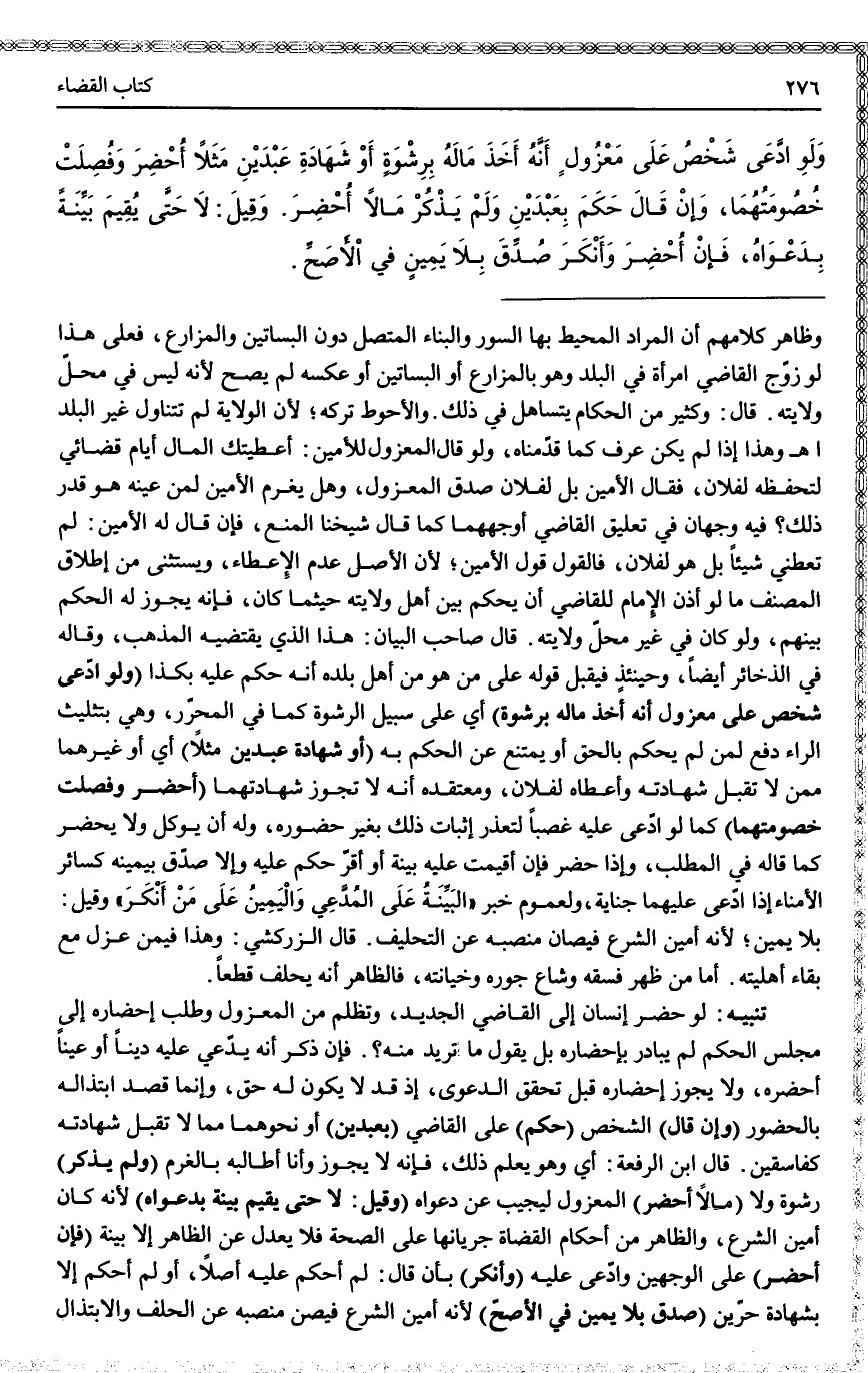 (وَلَوْ) (ادَّعَى شَخْصٌ عَلَى مَعْزُولٍ أَنَّهُ أَخَذَ مَالَهُ بِرِشْوَةٍ) أَيْ عَلَى سَبِيلِ الرِّشْوَةِ كَمَا فِي الْمُحَرَّرِ، وَهِيَ بِتَثْلِيثِ الرَّاءِ دَفَعَ لِمَنْ لَمْ يَحْكُمْ بِالْحَقِّ أَوْ يَمْتَنِعْ عَنْ الْحُكْمِ بِهِ (أَوْ شَهَادَةِ عَبْدَيْنِ مَثَلًا) أَيْ أَوْ غَيْرِهِمَا مِمَّنْ لَا تُقْبَلُ شَهَادَتُهُ وَأَعْطَاهُ لِفُلَانٍ، وَمُعْتَقَدُهُ أَنَّهُ لَا تَجُوزُ شَهَادَتُهُمَا (أُحْضِرَ وَفُصِلَتْ خُصُومَتُهُمَا) كَمَا لَوْ ادَّعَى عَلَيْهِ غَصْبًا لِتَعَذُّرِ إثْبَاتِ ذَلِكَ بِغَيْرِ حُضُورِهِ، وَلَهُ أَنْ يُوَكِّلَ وَلَا يَحْضُرَ كَمَا قَالَهُ فِي الْمَطْلَبِ، وَإِذَا حَضَرَ فَإِنْ أُقِيمَتْ عَلَيْهِ بَيِّنَةٌ أَوْ أَقَرَّ حُكِمَ عَلَيْهِ وَإِلَّا صُدِّقَ بِيَمِينِهِ كَسَائِرِ الْأُمَنَاءِ إذَا ادَّعَى عَلَيْهِمَا جِنَايَةً وَلِعُمُومِ خَبَرِ «الْبَيِّنَةِ عَلَى الْمُدَّعِي وَالْيَمِينُ عَلَى مَنْ أَنْكَرَ» وَقِيلَ: بِلَا يَمِينٍ؛ لِأَنَّهُ أَمِينُ الشَّرْعِ فَيُصَانُ مَنْصِبُهُ عَنْ التَّحْلِيفِ. قَالَ الزَّرْكَشِيُّ: وَهَذَا فِيمَنْ عُزِلَ مَعَ بَقَاءِ أَهْلِيَّتِهِ. أَمَّا مَنْ ظَهَرَ فِسْقُهُ وَشَاعَ جَوْرُهُ وَخِيَانَتُهُ، فَالظَّاهِرُ أَنَّهُ يَحْلِفُ قَطْعًا.