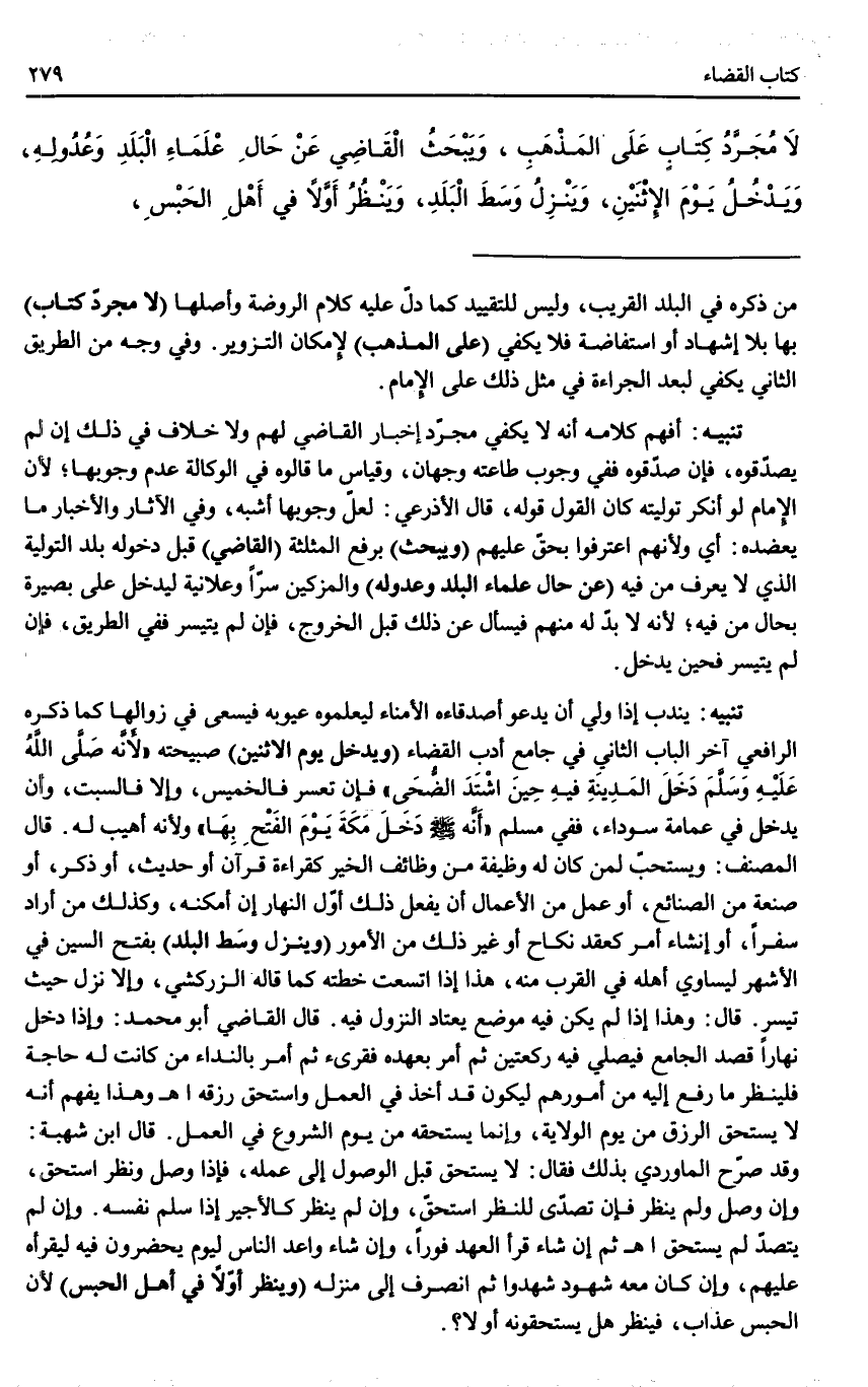 وَيَبْحَثُ الْقَاضِي عَنْ حَالِ عُلَمَاءِ الْبَلَدِ وَعُدُولِهِ، وَيَدْخُلُ يَوْمَ الِاثْنَيْنِ، وَيَنْزِلُ وَسَطَ الْبَلَدِ.
