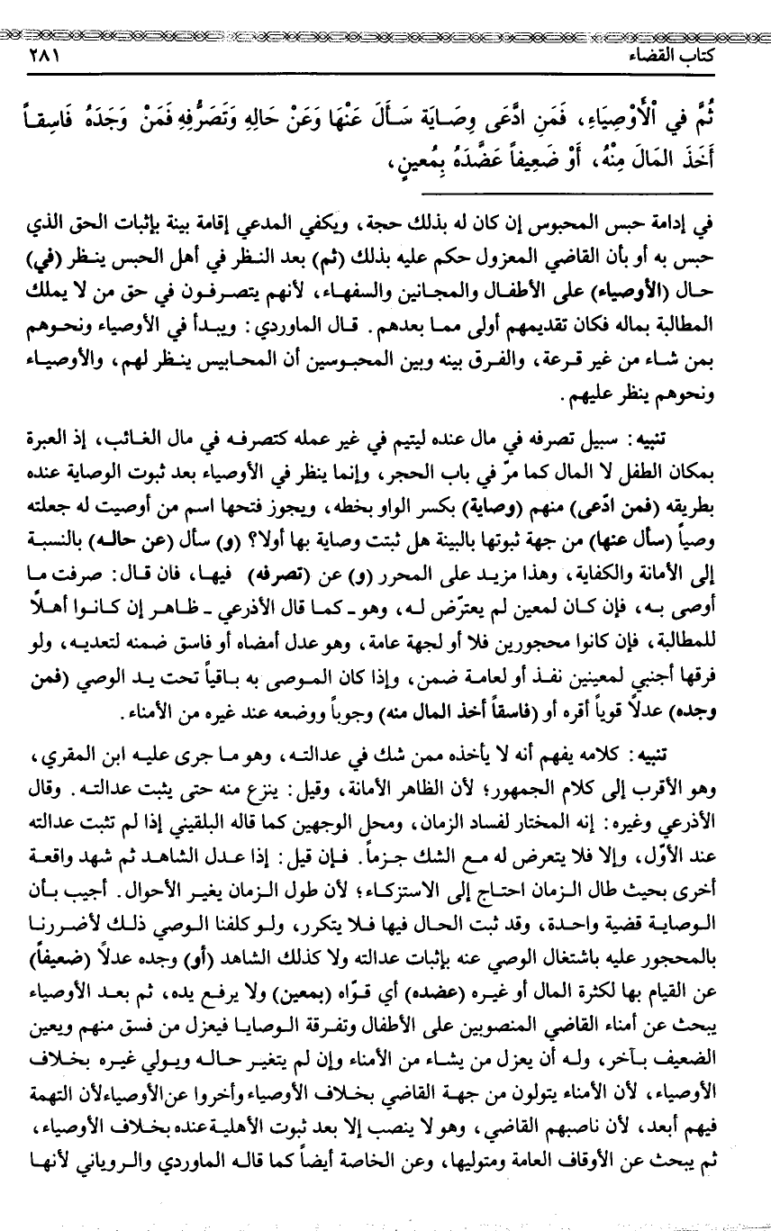(ثُمَّ) بَعْدَ النَّظَرِ فِي أَهْلِ الْحَبْسِ يَنْظُرُ (فِي) حَالِ (الْأَوْصِيَاءِ) عَلَى الْأَطْفَالِ وَالْمَجَانِينِ وَالسُّفَهَاءِ، لِأَنَّهُمْ يَتَصَرَّفُونَ فِي حَقِّ مَنْ لَا يَمْلِكُ الْمُطَالَبَةَ بِمَالِهِ فَكَانَ تَقْدِيمُهُمْ أَوْلَى مِمَّا بَعْدَهُمْ. قَالَ الْمَاوَرْدِيُّ: يَبْدَأُ فِي الْأَوْصِيَاءِ وَنَحْوِهِمْ بِمَنْ شَاءَ مِنْ غَيْرِ قُرْعَةٍ، وَالْفَرْقُ بَيْنَهُ وَبَيْنَ الْمَحْبُوسِينَ أَنَّ الْمَحَابِيسَ يَنْظُرُ لَهُمْ، وَالْأَوْصِيَاءَ وَنَحْوَهُمْ يَنْظُرُ عَلَيْهِمْ.