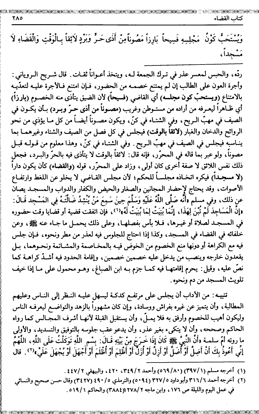 وَيُسْتَحَبُّ كَوْنُ مَجْلِسِهِ فَسِيحًا بَارِزًا مَصُونًا مِنْ أَذَى حَرٍّ وَبَرْدٍ لَائِقًا بِالْوَقْتِ وَالْقَضَاءِ لَا مَسْجِدًا.