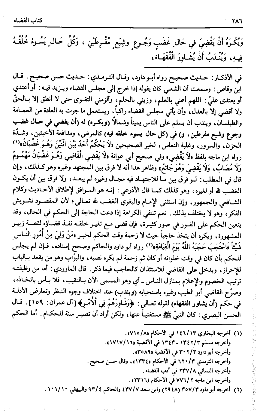 وَيُكْرَهُ أَنْ يَقْضِيَ فِي حَالِ غَضَبٍ وَجُوعٍ وَشِبَعٍ مُفْرِطَيْنِ، وَكُلِّ حَالٍ يَسُوءُ خُلُقُهُ فِيهِ، وَيُنْدَبُ أَنْ يُشَاوِرَ الْفُقَهَاءَ.
