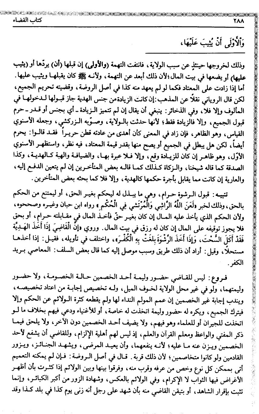 تَنْبِيهٌ قَبُولُ الرِّشْوَةِ حَرَامٌ، وَهِيَ مَا يُبْذَلُ لَهُ لِيَحْكُمَ بِغَيْرِ الْحَقِّ، أَوْ لِيَمْتَنِعَ مِنْ الْحُكْمِ بِالْحَقِّ وَذَلِكَ لِخَبَرِ «لَعَنَ اللَّهُ الرَّاشِيَ وَالْمُرْتَشِيَ فِي الْحُكْمِ» رَوَاهُ ابْنُ حِبَّانَ وَغَيْرُهُ وَصَحَّحُوهُ، وَلِأَنَّ الْحُكْمَ الَّذِي يَأْخُذُ عَلَيْهِ الْمَالَ إنْ كَانَ بِغَيْرِ حَقٍّ فَأَخْذَ الْمَالَ فِي مُقَابَلَتِهِ حَرَامٌ، أَوْ بِحَقٍّ فَلَا يَجُوزُ تَوْقِيفُهُ عَلَى الْمَالِ إنْ كَانَ لَهُ رِزْقٌ فِي بَيْتِ الْمَالِ وَرُوِيَ «إنَّ الْقَاضِيَ إذَا أَخَذَ الْهَدِيَّةَ فَقَدْ أَكَلَ السُّحْتَ، وَإِذَا أَخَذَ الرِّشْوَةَ بَلَغَتْ بِهِ الْكُفْرَ» ، وَاخْتُلِفَ فِي تَأْوِيلِهِ، فَقِيلَ: إذَا أَخَذَهَا مُسْتَحِلًّا، وَقِيلَ: أَرَادَ أَنَّ ذَلِكَ طَرِيقٌ وَسَبَبٌ مُوصِلٌ إلَيْهِ كَمَا قَالَ بَعْضُ السَّلَفِ: الْمَعَاصِي بَرِيدُ الْكُفْرِ.