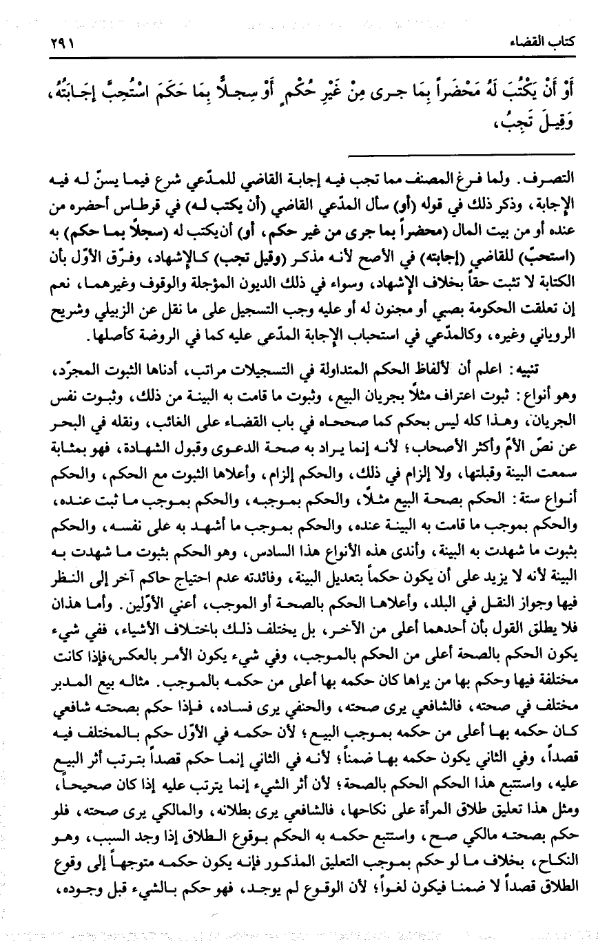 تَنْبِيهٌ اعْلَمْ أَنَّ لِأَلْفَاظِ الْحُكْمِ الْمُتَدَاوَلَةِ فِي التَّسْجِيلَاتِ مَرَاتِبُ؛ أَدْنَاهَا الثُّبُوتُ الْمُجَرَّدُ، وَهُوَ أَنْوَاعٌ: ثُبُوتُ اعْتِرَافٍ مَثَلًا بِجَرَيَانِ الْبَيْعِ، وَثُبُوتُ مَا قَامَتْ بِهِ الْبَيِّنَةُ مِنْ ذَلِكَ، وَثُبُوتُ نَفْسِ الْجَرَيَانِ، وَهَذَا كُلُّهُ لَيْسَ بِحُكْمٍ كَمَا صَحَّحَاهُ فِي بَابِ الْقَضَاءِ عَلَى الْغَائِبِ، وَنَقَلَهُ فِي الْبَحْرِ عَنْ نَصِّ الْأُمِّ وَأَكْثَرِ الْأَصْحَابِ؛ لِأَنَّهُ إنَّمَا يُرَادُ بِهِ صِحَّةُ الدَّعْوَى وَقَبُولُ الشَّهَادَةِ، فَهُوَ بِمَثَابَةِ سَمِعْتُ الْبَيِّنَةَ وَقَبِلْتُهَا، وَلَا إلْزَامَ فِي ذَلِكَ، وَالْحُكْمُ إلْزَامٌ، وَأَعْلَاهَا الثُّبُوتُ مَعَ الْحُكْمِ وَالْحُكْمُ أَنْوَاعٌ سِتَّةٌ: الْحُكْمُ بِصِحَّةِ الْبَيْعِ مَثَلًا، وَالْحُكْمُ بِمُوجَبِهِ، وَالْحُكْمُ بِمُوجَبِ مَا ثَبَتَ عِنْدَهُ، وَالْحُكْمُ بِمُوجَبِ مَا قَامَتْ بِهِ الْبَيِّنَةُ عِنْدَهُ، وَالْحُكْمُ بِمُوجَبِ مَا أَشْهَدَ بِهِ عَلَى نَفْسِهِ، وَالْحُكْمُ بِثُبُوتِ مَا شَهِدَتْ بِهِ الْبَيِّنَةُ، وَأَدْنَى هَذِهِ الْأَنْوَاعِ هَذَا السَّادِسُ، وَهُوَ الْحُكْمُ بِثُبُوتِ مَا شَهِدَتْ بِهِ الْبَيِّنَةُ؛ لِأَنَّهُ لَا يَزِيدُ عَلَى أَنْ يَكُونَ حُكْمًا بِتَعْدِيلِ الْبَيِّنَةِ، وَفَائِدَتُهُ عَدَمُ احْتِيَاجِ حَاكِمٍ آخَرَ إلَى النَّظَرِ فِيهَا وَجَوَازُ النَّقْلِ فِي الْبَلَدِ، وَأَعْلَاهَا الْحُكْمُ بِالصِّحَّةِ أَوْ الْمُوجَبِ، أَعْنِي الْأَوَّلَيْنِ.