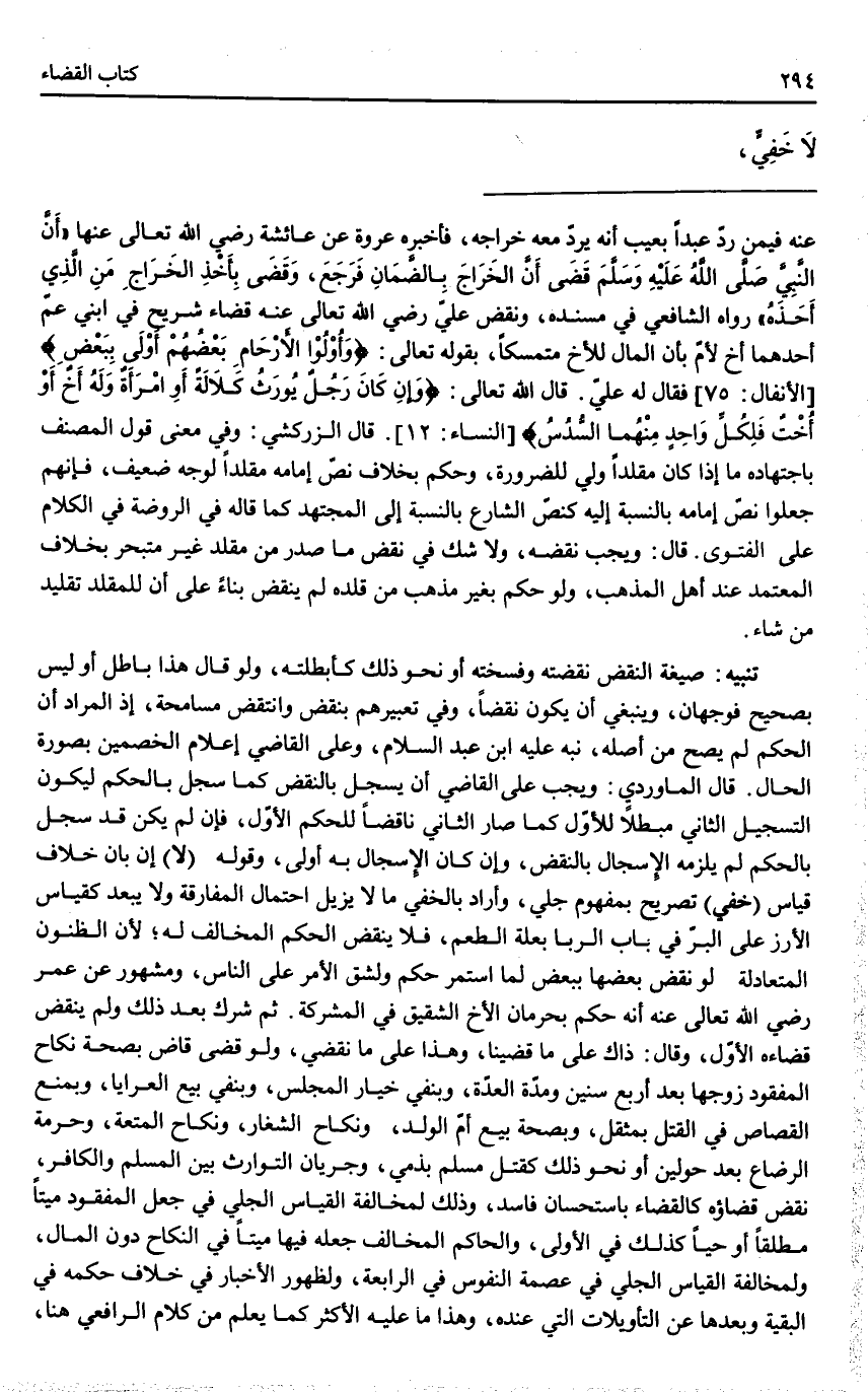 ـــــــــــــــــــــــــــــQفِيمَنْ رَدَّ عَبْدًا بِعَيْبٍ أَنَّهُ يَرُدُّ مَعَهُ خَرَاجَهُ، فَأَخْبَرَهُ عُرْوَةُ عَنْ عَائِشَةَ - رَضِيَ اللَّهُ تَعَالَى عَنْهَا - أَنَّ «النَّبِيَّ - صَلَّى اللَّهُ عَلَيْهِ وَسَلَّمَ - قَضَى أَنَّ الْخَرَاجَ بِالضَّمَانِ» فَرَجَعَ، وَقَضَى بِأَخْذِ الْخَرَاجِ مِنْ الَّذِي أَخَذَهُ رَوَاهُ الشَّافِعِيُّ فِي مُسْنَدِهِ وَنَقَضَ عَلِيٌّ - رَضِيَ اللَّهُ تَعَالَى عَنْهُ - قَضَاءَ شُرَيْحٍ فِي ابْنَيْ عَمٍّ أَحَدُهُمَا أَخٌ لِأُمٍّ بِأَنَّ الْمَالَ لِلْأَخِ مُتَمَسِّكًا، بِقَوْلِهِ تَعَالَى: {وَأُولُو الأَرْحَامِ بَعْضُهُمْ أَوْلَى بِبَعْضٍ} [الأنفال: 75] فَقَالَ لَهُ عَلِيٌّ. قَالَ اللَّهُ تَعَالَى: {وَإِنْ كَانَ رَجُلٌ يُورَثُ كَلالَةً أَوِ امْرَأَةٌ وَلَهُ أَخٌ أَوْ أُخْتٌ فَلِكُلِّ وَاحِدٍ مِنْهُمَا السُّدُسُ} [النساء: 12] قَالَ الزَّرْكَشِيُّ: وَفِي مَعْنَى قَوْلِ الْمُصَنِّفِ بِاجْتِهَادِهِ مَا إذَا كَانَ مُقَلِّدًا وُلِّيَ لِلضَّرُورَةِ، وَحَكَمَ بِخِلَافِ نَصِّ إمَامِهِ مُقَلِّدًا لِوَجْهٍ ضَعِيفٍ، فَإِنَّهُمْ جَعَلُوا نَصَّ إمَامِهِ بِالنِّسْبَةِ إلَيْهِ كَنَصِّ الشَّارِعِ بِالنِّسْبَةِ إلَى الْمُجْتَهِدِ كَمَا قَالَهُ فِي الرَّوْضَةِ فِي الْكَلَامِ عَلَى الْفَتْوَى. قَالَ: وَيَجِبُ نَقْضُهُ، وَلَا شَكَّ فِي نَقْضِ مَا صَدَرَ مِنْ مُقَلِّدٍ غَيْرِ مُتَبَحِّرٍ بِخِلَافِ الْمُعْتَمَدِ عِنْدَ أَهْلِ الْمَذْهَبِ، وَلَوْ حَكَمَ بِغَيْرِ مَذْهَبِ مَنْ قَلَّدَهُ لَمْ يُنْقَضْ بِنَاءً عَلَى أَنَّ لِلْمُقَلِّدِ تَقْلِيدَ مَنْ شَاءَ.