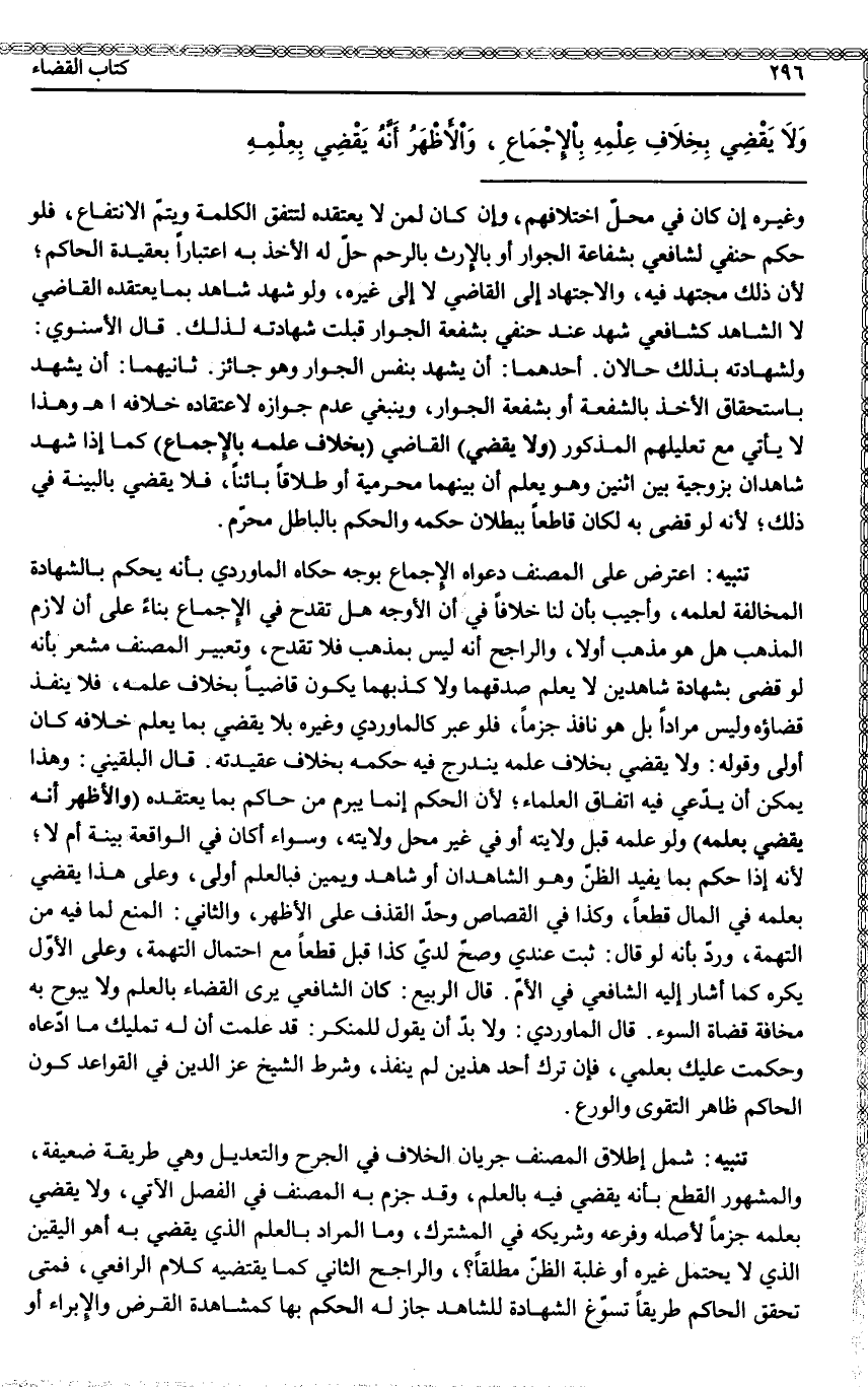 وَأُجِيبَ بِأَنَّ لَنَا خِلَافًا فِي أَنَّ الْأَوْجُهَ هَلْ تَقْدَحُ فِي الْإِجْمَاعِ بِنَاءً عَلَى أَنَّ لَازِمَ الْمَذْهَبِ هَلْ هُوَ مَذْهَبٌ أَوْ لَا، وَالرَّاجِحُ أَنَّهُ لَيْسَ بِمَذْهَبٍ فَلَا تَقْدَحْ، وَتَعْبِيرُ الْمُصَنِّفِ مُشْعِرٌ بِأَنَّهُ لَوْ قَضَى بِشَهَادَةِ شَاهِدَيْنِ لَا يَعْلَمُ صِدْقَهُمَا وَلَا كِذْبَهُمَا يَكُونُ قَاضِيًا بِخِلَافِ عِلْمِهِ، فَلَا يَنْفُذُ قَضَاؤُهُ وَلَيْسَ مُرَادًا بَلْ هُوَ نَافِذٌ جَزْمًا، فَلَوْ عَبَّرَ كَالْمَاوَرْدِيِّ وَغَيْرِهِ بِلَا يَقْضِي بِمَا يَعْلَمُ خِلَافَهُ كَانَ أَوْلَى وَقَوْلُهُ: وَلَا يَقْضِي بِخِلَافِ عِلْمِهِ يَنْدَرِجُ فِيهِ حُكْمُهُ بِخِلَافِ عَقِيدَتِهِ. قَالَ الْبُلْقِينِيُّ: وَهَذَا يُمْكِنُ أَنْ يَدَّعِيَ فِيهِ اتِّفَاقَ الْعُلَمَاءِ؛ لِأَنَّ الْحُكْمَ إنَّمَا يُبْرَمُ مِنْ حَاكِمٍ بِمَا يَعْتَقِدُهُ (وَالْأَظْهَرُ أَنَّهُ يَقْضِي بِعِلْمِهِ) وَلَوْ عَلِمَهُ قَبْلَ وِلَايَتِهِ أَوْ فِي غَيْرِ مَحِلِّ وِلَايَتِهِ، وَسَوَاءٌ أَكَانَ فِي الْوَاقِعَةِ بَيِّنَةٌ أَمْ لَا؛ لِأَنَّهُ إذَا حَكَمَ بِمَا يُفِيدُ الظَّنَّ وَهُوَ الشَّاهِدَانِ أَوْ شَاهِدٌ وَيَمِينٌ فَبِالْعِلْمِ أَوْلَى، وَعَلَى هَذَا يَقْضِي بِعِلْمِهِ فِي الْمَالِ قَطْعًا، وَكَذَا فِي الْقِصَاصِ وَحَدِّ الْقَذْفِ عَلَى الْأَظْهَرِ، وَالثَّانِي: الْمَنْعُ لِمَا فِيهِ مِنْ التُّهْمَةِ، وَرَدَّ بِأَنَّهُ لَوْ قَالَ: ثَبَتَ عِنْدِي وَصَحَّ لَدَيَّ كَذَا قُبِلَ قَطْعًا مَعَ احْتِمَالِ التُّهْمَةِ، وَعَلَى الْأَوَّلِ يُكْرَهُ كَمَا أَشَارَ إلَيْهِ الشَّافِعِيُّ فِي الْأُمِّ. قَالَ الرَّبِيعُ: كَانَ الشَّافِعِيُّ يَرَى الْقَضَاءَ بِالْعِلْمِ وَلَا يَبُوحُ بِهِ مَخَافَةَ قُضَاةِ السُّوءِ. قَالَ الْمَاوَرْدِيُّ: وَلَا بُدَّ أَنْ يَقُولَ لِلْمُنْكِرِ: قَدْ عَلِمْتُ أَنَّ لَهُ تَمْلِيكَ مَا ادَّعَاهُ وَحَكَمْتُ عَلَيْكَ بِعِلْمِي، فَإِنْ تَرَكَ أَحَدٌ هَذَيْنِ لَمْ يَنْفُذْ، وَشَرَطَ الشَّيْخُ عِزُّ الدِّينِ فِي الْقَوَاعِدِ كَوْنَ الْحَاكِمِ ظَاهِرَ التَّقْوَى وَالْوَرَعِ.