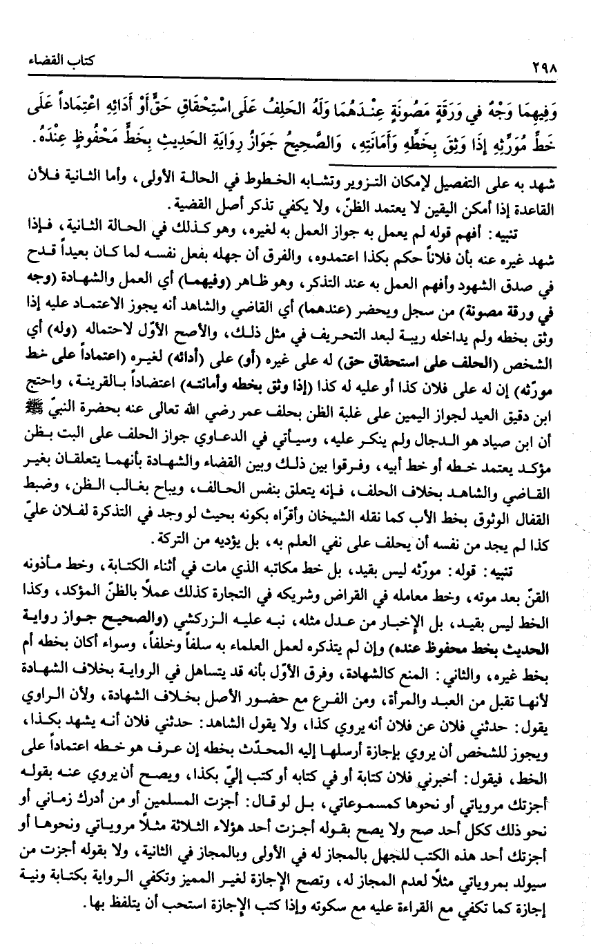 تَنْبِيهٌ أَفْهَمَ قَوْلُهُ لَمْ يَعْمَلْ بِهِ جَوَازَ الْعَمَلِ بِهِ لِغَيْرِهِ، وَهُوَ كَذَلِكَ فِي الْحَالَةِ الثَّانِيَةِ، فَإِذَا شَهِدَ غَيْرُهُ عَنْهُ بِأَنَّ فُلَانًا حَكَمَ بِكَذَا اعْتَمَدُوهُ، وَالْفَرْقُ أَنَّ جَهْلَهُ بِفِعْلِ نَفْسِهِ لَمَّا كَانَ بَعِيدًا قَدَحَ فِي صِدْقِ الشُّهُودِ وَأَفْهَمَ الْعَمَلَ بِهِ عِنْدَ التَّذَكُّرِ، وَهُوَ ظَاهِرٌ (وَفِيهِمَا) أَيْ الْعَمَلِ وَالشَّهَادَةِ (وَجْهٌ فِي وَرَقَةٍ مَصُونَةٍ) مِنْ سِجِلٍّ وَيَحْضُرُ (عِنْدَهُمَا) أَيْ الْقَاضِي وَالشَّاهِدِ أَنَّهُ يَجُوزُ الِاعْتِمَادُ عَلَيْهِ إذَا وَثِقَ بِخَطِّهِ وَلَمْ يُدَاخِلْهُ رِيبَةٌ لِبُعْدِ التَّحْرِيفِ فِي مِثْلِ ذَلِكَ، وَالْأَصَحُّ الْأَوَّلُ لِاحْتِمَالِهِ (وَلَهُ) أَيْ الشَّخْصِ (الْحَلِفُ عَلَى اسْتِحْقَاقِ حَقٍّ) لَهُ عَلَى غَيْرِهِ (أَوْ) عَلَى (أَدَائِهِ) لِغَيْرِهِ (اعْتِمَادًا عَلَى خَطِّ مُوَرِّثِهِ) أَنَّ لَهُ عَلَى فُلَانٍ كَذَا أَوْ عَلَيْهِ لَهُ كَذَا (إذَا وَثِقَ بِخَطِّهِ وَأَمَانَتِهِ) اعْتِضَادًا بِالْقَرِينَةِ وَاحْتَجَّ ابْنُ دَقِيقِ الْعِيدِ لِجَوَازِ الْيَمِينِ عَلَى غَلَبَةِ الظَّنِّ بِحَلِفِ عُمَرَ - رَضِيَ اللَّهُ تَعَالَى عَنْهُ - بِحَضْرَةِ النَّبِيِّ - صَلَّى اللَّهُ عَلَيْهِ وَسَلَّمَ - أَنَّ ابْنَ صَيَّادٍ هُوَ الدَّجَّالُ وَلَمْ يُنْكِرْ عَلَيْهِ، وَسَيَأْتِي فِي الدَّعَاوَى جَوَازُ الْحَلِفِ عَلَى الْبَتِّ بِظَنٍّ مُؤَكِّدٍ يَعْتَمِدُ خَطَّهُ أَوْ خَطَّ أَبِيهِ، وَفَرَّقُوا بَيْنَ ذَلِكَ وَبَيْنَ الْقَضَاءِ وَالشَّهَادَةِ بِأَنَّهُمَا يَتَعَلَّقَانِ بِغَيْرِ الْقَاضِي وَالشَّاهِدِ بِخِلَافِ الْحَلِفِ، فَإِنَّهُ يَتَعَلَّقُ بِنَفْسِ الْحَالِفِ، وَيُبَاحُ بِغَالِبِ الظَّنِّ، وَضَبَطَ الْقَفَّالُ الْوُثُوقَ بِخَطِّ الْأَبِ كَمَا نَقَلَهُ الشَّيْخَانِ وَأَقَرَّاهُ بِكَوْنِهِ بِحَيْثُ لَوْ وَجَدَ فِي التَّذْكِرَةِ لِفُلَانٍ عَلَيَّ كَذَا لَمْ يَجِدْ مِنْ نَفْسِهِ أَنْ يَحْلِفَ عَلَى نَفْيِ الْعِلْمِ بِهِ، بَلْ يُؤَدِّيَهُ مِنْ التَّرِكَةِ.