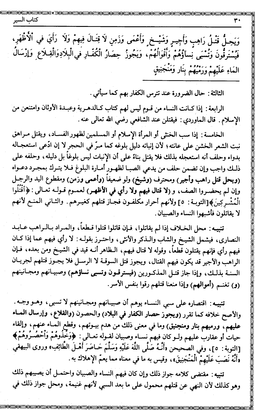 وَيَحِلُّ قَتْلُ رَاهِبٍ وَأَجِيرٍ وَشَيْخٍ وَأَعْمَى وَزَمِنٍ لَا قِتَالَ فِيهِمْ وَلَا رَأْيٍ فِي الْأَظْهَرِ، فَيُسْتَرَقُّونَ وَتُسْبَى نِسَاؤُهُمْ وَأَقْوَالُهُمْ.