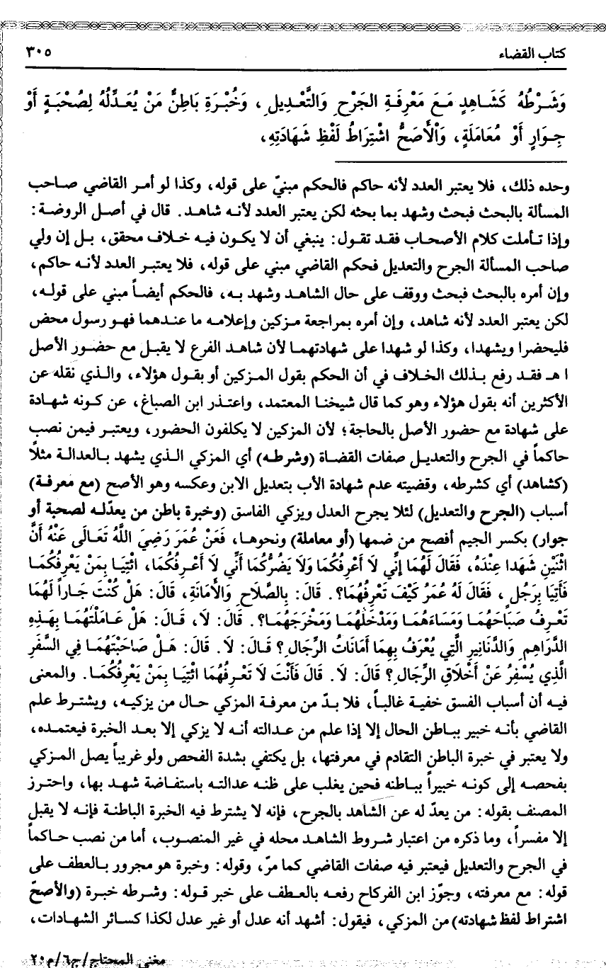 (وَشَرْطُهُ) أَيْ الْمُزَكِّي الَّذِي يَشْهَدُ بِالْعَدَالَةِ مَثَلًا (كَشَاهِدٍ) أَيْ كَشَرْطِهِ، وَقَضِيَّتُهُ عَدَمُ شَهَادَةِ الْأَبِ بِتَعْدِيلِ الِابْنِ وَعَكْسُهُ وَهُوَ الْأَصَحُّ (مَعَ مَعْرِفَةِ) أَسْبَابِ (الْجَرْحِ وَالتَّعْدِيلِ) لِئَلَّا يَجْرَحَ الْعَدْلَ وَيُزَكِّيَ الْفَاسِقَ (وَخُبْرَةِ بَاطِنِ مَنْ يَعْدِلُهُ لِصُحْبَةٍ أَوْ جِوَارٍ) بِكَسْرِ الْجِيمِ أَفْصَحُ مِنْ ضَمِّهَا (أَوْ مُعَامَلَةٍ) وَنَحْوِهَا، فَعَنْ عُمَرَ - رَضِيَ اللَّهُ تَعَالَى عَنْهُ - أَنَّ اثْنَيْنِ شَهِدَا عِنْدَهُ، فَقَالَ لَهُمَا إنِّي لَا أَعْرِفُكُمَا وَلَا يَضُرُّكُمَا أَنِّي لَا أَعْرِفُكُمَا، ائْتِيَا بِمَنْ يَعْرِفُكُمَا فَأَتَيَا بِرَجُلٍ، فَقَالَ لَهُ عُمَرُ كَيْفَ تَعْرِفُهُمَا؟ . قَالَ: بِالصَّلَاحِ وَالْأَمَانَةِ، قَالَ: هَلْ كُنْت جَارًا لَهُمَا تَعْرِفُ صَبَاحَهُمَا وَمَسَاءَهُمَا وَمَدْخَلَهُمَا وَمَخْرَجَهُمَا؟ . قَالَ: لَا، قَالَ: هَلْ عَامَلْتَهُمَا بِهَذِهِ الدَّرَاهِمِ وَالدَّنَانِيرِ الَّتِي يُعْرَفُ بِهِمَا أَمَانَاتُ الرِّجَالِ؟ قَالَ: لَا. قَالَ: هَلْ صَاحِبْتَهُمَا فِي السَّفَرِ الَّذِي يُسْفِرُ عَنْ أَخْلَاقِ الرِّجَالِ؟ قَالَ: لَا. قَالَ فَأَنْتَ لَا تَعْرِفُهُمَا ائْتِيَا بِمَنْ يَعْرِفُكُمَا. وَالْمَعْنَى فِيهِ أَنَّ أَسْبَابَ الْفِسْقِ خَفِيَّةٌ غَالِبًا، فَلَا بُدَّ مِنْ مَعْرِفَةِ الْمُزَكِّي حَالَ مَنْ يُزَكِّيهِ، وَيُشْتَرَطُ عِلْمُ الْقَاضِي بِأَنَّهُ خَبِيرٌ بِبَاطِنِ الْحَالِ إلَّا إذَا عَلِمَ مِنْ عَدَالَتِهِ أَنَّهُ لَا يُزَكِّي إلَّا بَعْدَ الْخُبْرَةِ فَيَعْتَمِدُهُ، وَلَا يَعْتَبِرُ فِي خُبْرَةِ الْبَاطِنِ التَّقَادُمُ فِي مَعْرِفَتِهَا، بَلْ يَكْتَفِي بِشِدَّةِ الْفَحْصِ وَلَوْ غَرِيبًا يَصِلُ الْمُزَكِّي بِفَحْصِهِ إلَى كَوْنِهِ خَبِيرًا بِبَاطِنِهِ فَحِينَ يَغْلِبُ عَلَى ظَنِّهِ عَدَالَتُهُ بِاسْتِفَاضَةٍ شَهِدَ بِهَا.