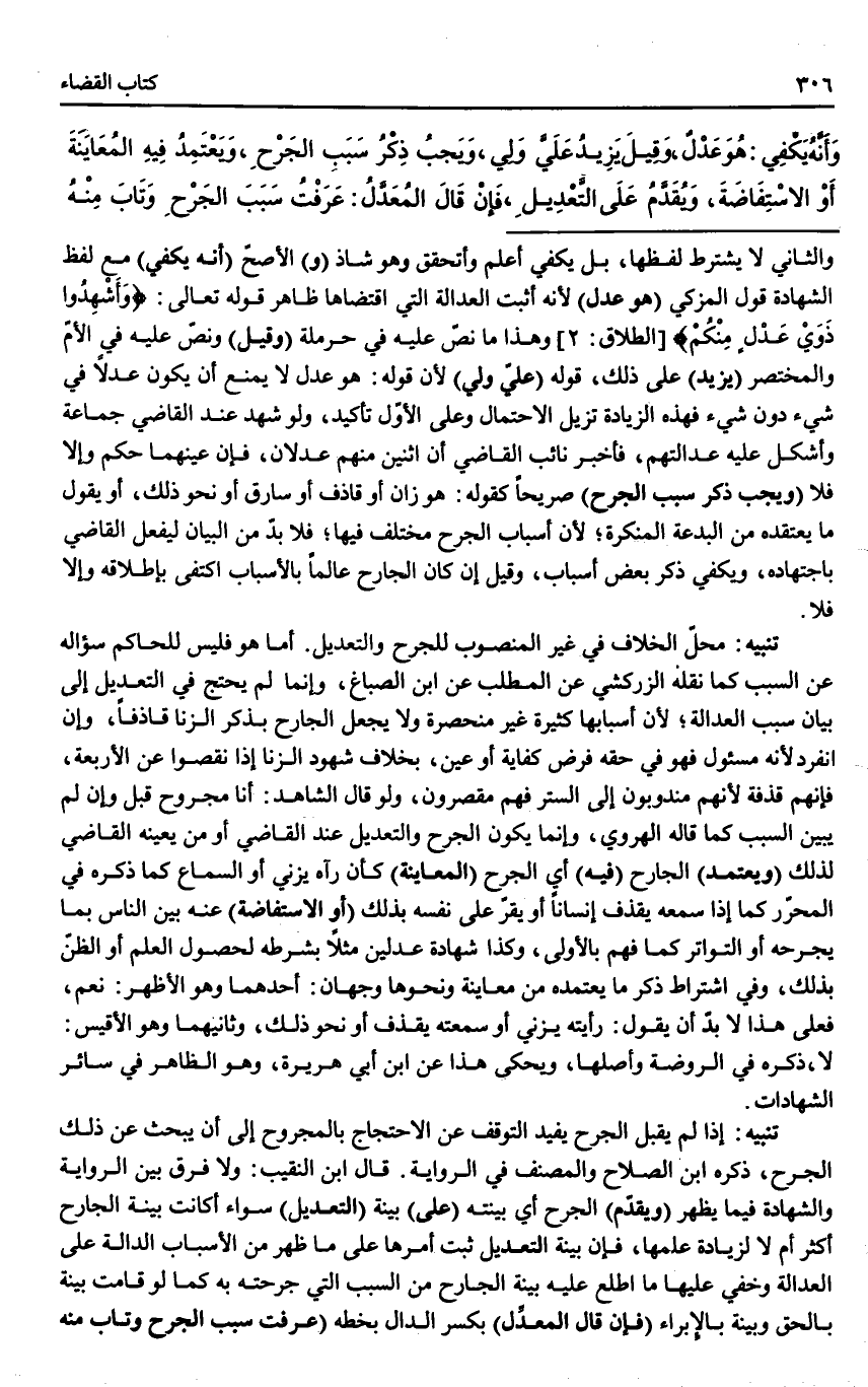 وَأَنَّهُ يَكْفِي: هُوَ عَدْلٌ، وَقِيلَ يَزِيدُ عَلَيَّ وَلِي، وَيَجِبُ ذِكْرُ سَبَبِ الْجَرْحِ، وَيَعْتَمِدُ فِيهِ الْمُعَايَنَةَ أَوْ الِاسْتِفَاضَةَ، وَيُقَدَّمُ عَلَى التَّعْدِيلِ.