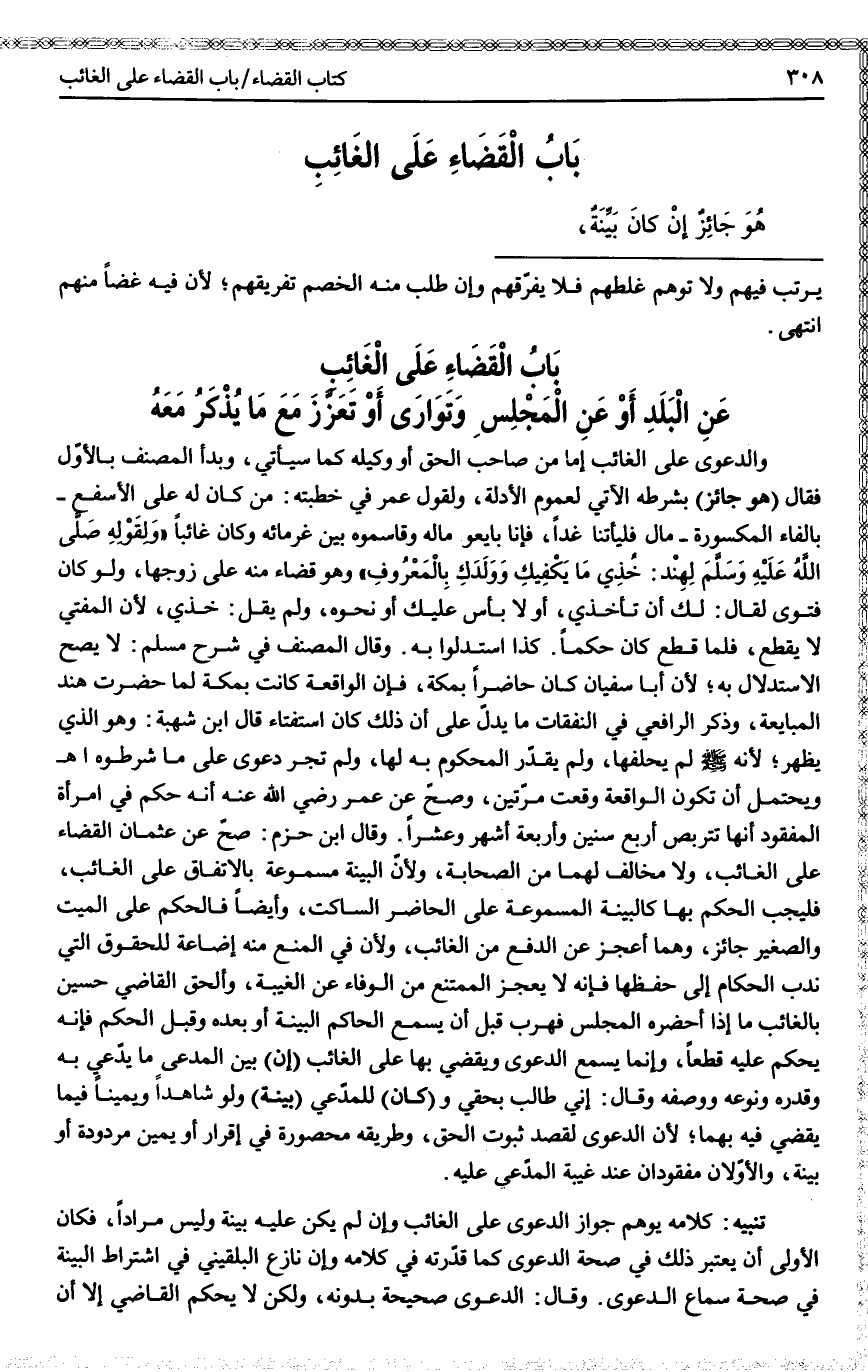 (بَابُ الْقَضَاءِ عَلَى الْغَائِبِ) عَنْ الْبَلَدِ أَوْ عَنْ الْمَجْلِسِ وَتَوَارَى أَوْ تَعَزَّزَ مَعَ مَا يُذْكَرُ مَعَهُ وَالدَّعْوَى عَلَى الْغَائِبِ إمَّا مِنْ صَاحِبِ الْحَقِّ أَوْ وَكِيلِهِ كَمَا سَيَأْتِي، وَبَدَأَ الْمُصَنِّفُ بِالْأَوَّلِ فَقَالَ (هُوَ جَائِزٌ) بِشَرْطِهِ الْآتِي لِعُمُومِ الْأَدِلَّةِ وَلِقَوْلِ عُمَرَ فِي خُطْبَتِهِ: مَنْ كَانَ لَهُ عَلَى الْأَسْفِعِ - بِالْفَاءِ الْمَكْسُورَةِ - مَالٌ فَلْيَأْتِنَا غَدًا، فَإِنَّا بَايِعُوا مَالَهُ وَقَاسِمُوهُ بَيْنَ غُرَمَائِهِ وَكَانَ غَائِبًا وَلِقَوْلِهِ - صَلَّى اللَّهُ عَلَيْهِ وَسَلَّمَ - لِهِنْدٍ: «خُذِي مَا يَكْفِيكِ وَوَلَدَكِ بِالْمَعْرُوفِ» وَهُوَ قَضَاءٌ مِنْهُ عَلَى زَوْجِهَا، وَلَوْ كَانَ فَتْوَى لَقَالَ: لَكِ أَنْ تَأْخُذِي، أَوْ لَا بَأْسَ عَلَيْكِ أَوْ نَحْوَهُ، وَلَمْ يَقُلْ: خُذِي؛ لِأَنَّ الْمُفْتِيَ لَا يَقْطَعُ، فَلَمَّا قَطَعَ كَانَ حُكْمًا. كَذَا اسْتَدَلُّوا بِهِ. وَقَالَ الْمُصَنِّفُ فِي شَرْحِ مُسْلِمٍ: لَا يَصِحُّ الِاسْتِدْلَال بِهِ؛ لِأَنَّ أَبَا سُفْيَانَ كَانَ حَاضِرًا بِمَكَّةَ، فَإِنَّ الْوَاقِعَةَ كَانَتْ بِمَكَّةَ لَمَّا حَضَرَتْ هِنْدٌ الْمُبَايَعَةَ، وَذَكَرَ الرَّافِعِيُّ فِي النَّفَقَاتِ مَا يَدُلُّ عَلَى أَنَّ ذَلِكَ كَانَ اسْتِفْتَاءً قَالَ ابْنُ شُهْبَةَ: وَهُوَ الَّذِي يَظْهَرُ؛ لِأَنَّهُ - صَلَّى اللَّهُ عَلَيْهِ وَسَلَّمَ - لَمْ يُحَلِّفْهَا، وَلَمْ يُقَدِّرْ الْمَحْكُومَ بِهِ لَهَا، وَلَمْ تَجْرِ دَعْوَى عَلَى مَا شَرَطُوهُ اهـ.