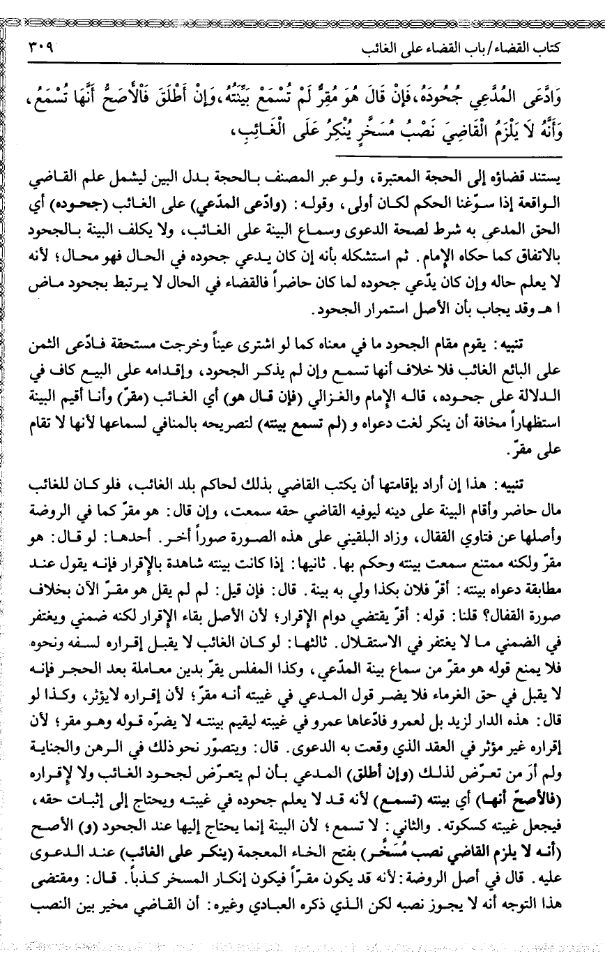 (وَ) الْأَصَحُّ (أَنَّهُ لَا يَلْزَمُ الْقَاضِي) (نَصْبُ مُسَخَّرٍ) بِفَتْحِ الْخَاءِ الْمُعْجَمَةِ (يُنْكِرُ عَلَى الْغَائِبِ) عِنْدَ الدَّعْوَى عَلَيْهِ. قَالَ فِي أَصْلِ الرَّوْضَةِ: لِأَنَّهُ قَدْ يَكُونُ مُقِرًّا فَيَكُونُ إنْكَارُ الْمُسَخَّرِ كَذِبًا. قَالَ: وَمُقْتَضَى هَذَا التَّوَجُّهِ أَنَّهُ لَا يَجُوزُ نَصْبُهُ لَكِنَّ الَّذِي ذَكَرَهُ الْعَبَّادِيُّ وَغَيْرُهُ: أَنَّ الْقَاضِيَ مُخَيَّرٌ بَيْنَ النَّصْبِ