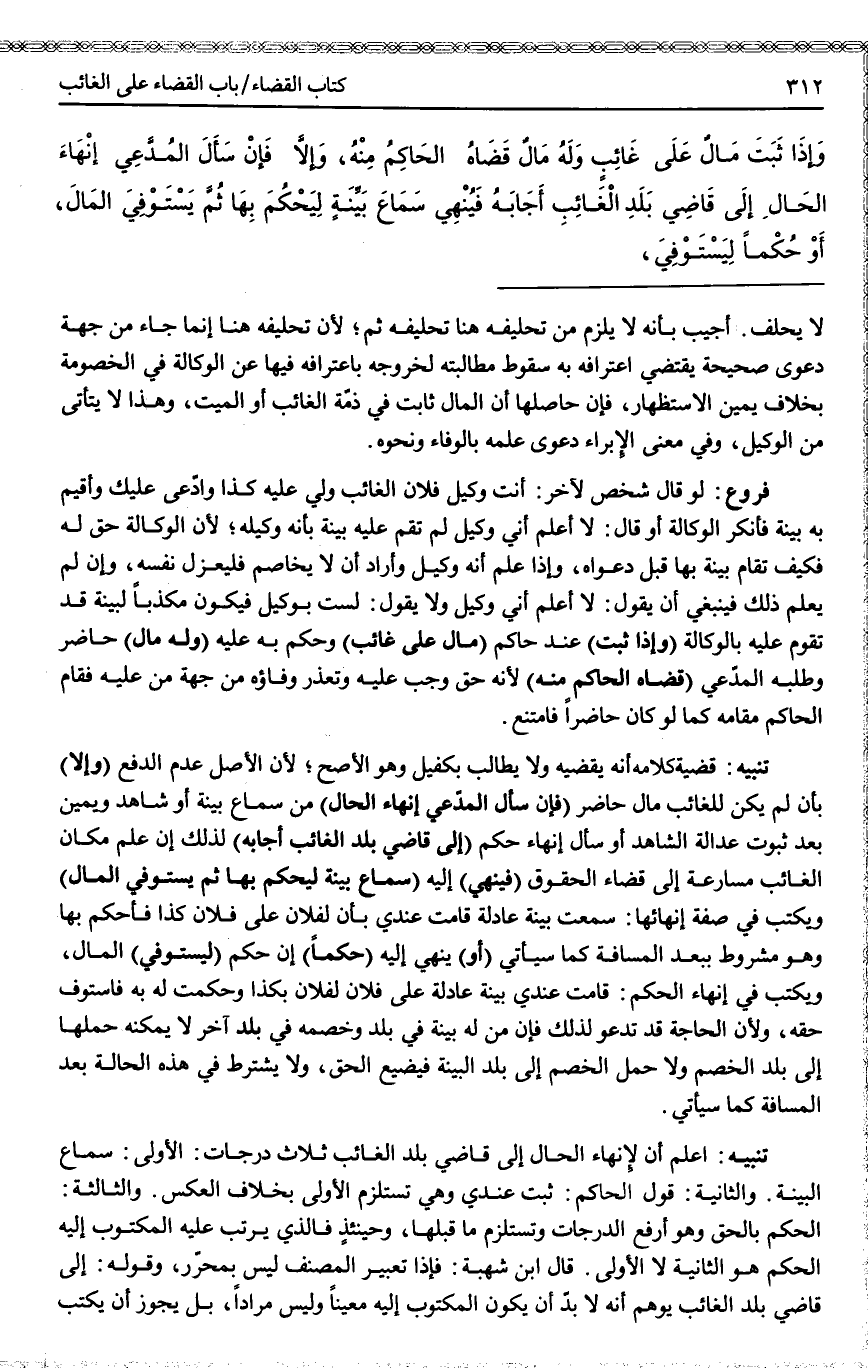 تَنْبِيهٌ اعْلَمْ أَنَّ لِإِنْهَاءِ الْحَالِ إلَى قَاضِي بَلَدِ الْغَائِبِ ثَلَاثُ دَرَجَاتٍ: الْأُولَى: سَمَاعُ الْبَيِّنَةِ. وَالثَّانِيَةُ: قَوْلُ الْحَاكِمِ: ثَبَتَ عِنْدِي وَهِيَ تَسْتَلْزِمُ الْأُولَى بِخِلَافِ الْعَكْسِ. وَالثَّالِثَةُ: الْحُكْمُ بِالْحَقِّ وَهُوَ أَرْفَعُ الدَّرَجَاتِ وَتَسْتَلْزِمُ مَا قَبْلَهَا، وَحِينَئِذٍ فَاَلَّذِي يُرَتَّبُ عَلَيْهِ الْمَكْتُوبُ إلَيْهِ الْحُكْمُ هُوَ الثَّانِيَةُ لَا الْأُولَى. قَالَ ابْنُ شُهْبَةَ: فَإِذًا تَعْبِيرُ الْمُصَنِّفِ لَيْسَ بِمُحَرَّرٍ، وَقَوْلُهُ: إلَى قَاضِي بَلَدِ الْغَائِبِ يُوهِمُ أَنَّهُ لَا بُدَّ أَنْ يَكُونَ الْمَكْتُوبُ إلَيْهِ مُعَيَّنًا وَلَيْسَ مُرَادًا، بَلْ يَجُوزُ أَنْ يَكْتُبَ