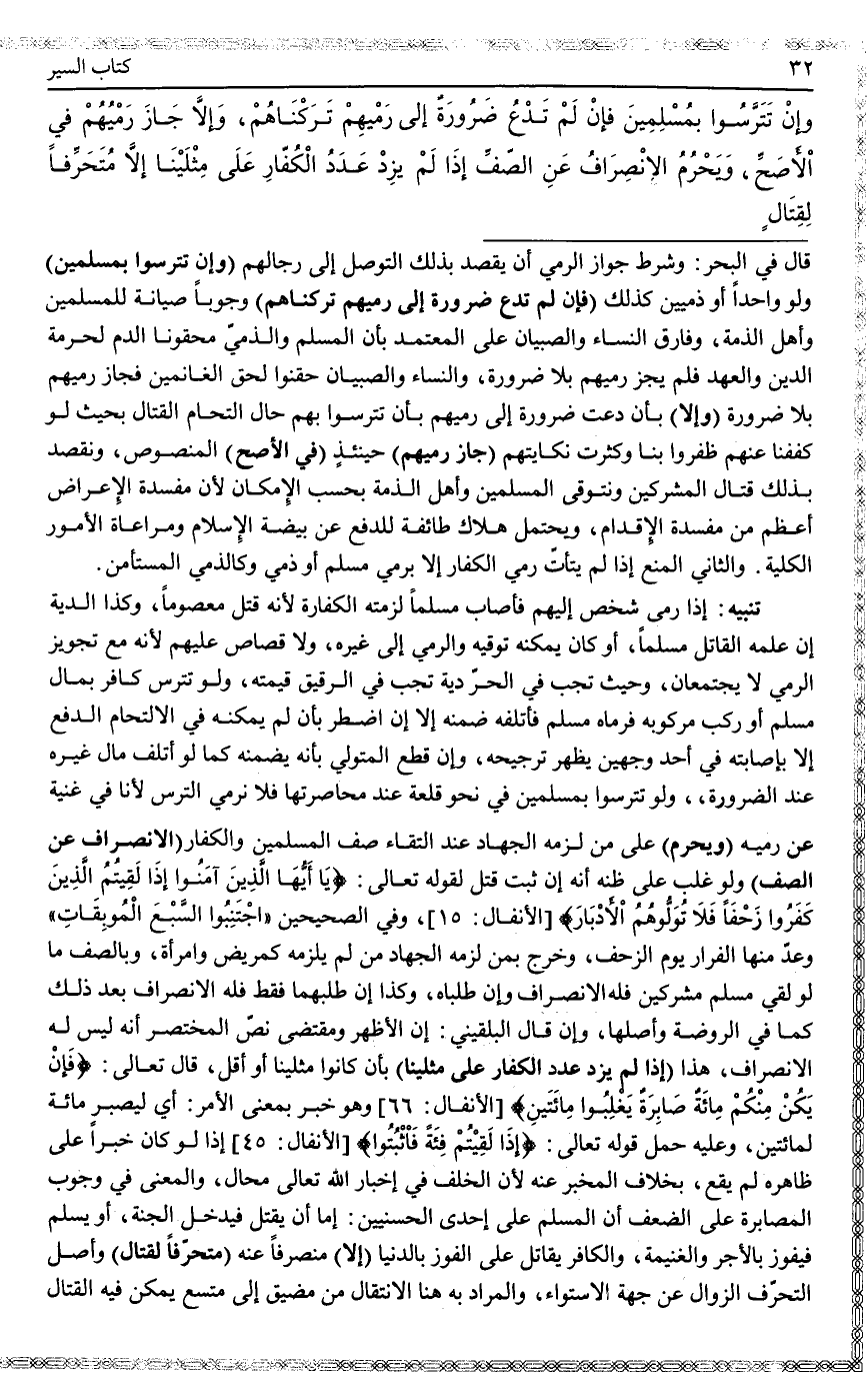 (وَيَحْرُمُ) عَلَى مَنْ لَزِمَهُ الْجِهَادُ عِنْدَ الْتِقَاءِ صَفِّ الْمُسْلِمِينَ وَالْكُفَّارِ (الِانْصِرَافُ عَنْ الصَّفِّ) وَلَوْ غَلَبَ عَلَى ظَنِّهِ أَنَّهُ إنْ ثَبَتَ قُتِلَ لِقَوْلِهِ تَعَالَى: {يَا أَيُّهَا الَّذِينَ آمَنُوا إِذَا لَقِيتُمُ الَّذِينَ كَفَرُوا زَحْفًا فَلا تُوَلُّوهُمُ الأَدْبَارَ} [الأنفال: 15] ، وَفِي الصَّحِيحَيْنِ «اجْتَنِبُوا السَّبْعَ الْمُوبِقَاتِ» وَعَدَّ مِنْهَا الْفِرَارَ يَوْمَ الزَّحْفِ، وَخَرَجَ بِمَنْ لَزِمَهُ الْجِهَادُ مَنْ لَمْ يَلْزَمْهُ كَمَرِيضٍ وَامْرَأَةٍ، وَبِالصَّفِّ مَا لَوْ لَقِيَ مُسْلِمٌ مُشْرِكَيْنِ فَلَهُ الِانْصِرَافُ وَإِنْ طَلَبَاهُ، وَكَذَا إنْ طَلَبَهُمَا فَقَطْ فَلَهُ الِانْصِرَافُ بَعْدَ ذَلِكَ كَمَا فِي الرَّوْضَةِ وَأَصْلِهَا، وَإِنْ قَالَ: الْبُلْقِينِيُّ: إنْ الْأَظْهَرَ وَمُقْتَضَى نَصِّ الْمُخْتَصَرِ أَنَّهُ لَيْسَ لَهُ الِانْصِرَافُ، هَذَا (إذَا لَمْ يَزِدْ عَدَدُ الْكُفَّارِ عَلَى مِثْلَيْنَا) بِأَنْ كَانُوا مِثْلَيْنَا أَوْ أَقَلَّ، قَالَ: تَعَالَى: {فَإِنْ يَكُنْ مِنْكُمْ مِائَةٌ صَابِرَةٌ يَغْلِبُوا مِائَتَيْنِ} [الأنفال: 66] وَهُوَ خَبَرٌ بِمَعْنَى الْأَمْرِ: أَيْ لِيَصْبِرْ مِائَةٌ لِمِائَتَيْنِ، وَعَلَيْهِ حُمِلَ قَوْله تَعَالَى: {إِذَا لَقِيتُمْ فِئَةً فَاثْبُتُوا} [الأنفال: 45] إذْ لَوْ كَانَ خَبَرًا عَلَى ظَاهِرِهِ لَمْ يَقَعْ، بِخِلَافِ الْمُخْبَرِ عَنْهُ؛ لِأَنَّ الْخُلْفَ فِي إخْبَارِ اللَّهِ تَعَالَى مُحَالٌ، وَالْمَعْنَى فِي وُجُوبِ الْمُصَابَرَةِ عَلَى الضَّعْفِ أَنَّ الْمُسْلِمَ عَلَى إحْدَى الْحُسْنَيَيْنِ: إمَّا أَنْ يُقْتَلَ فَيَدْخُلَ الْجَنَّةَ، أَوْ يَسْلَمَ فَيَفُوزَ بِالْأَجْرِ وَالْغَنِيمَةِ، وَالْكَافِرَ يُقَاتِلُ عَلَى الْفَوْزِ بِالدُّنْيَا (إلَّا) مُنْصَرِفًا عَنْهُ (مُتَحَرِّفًا لِقِتَالٍ) وَأَصْلُ التَّحَرُّفِ الزَّوَالُ عَنْ جِهَةِ الِاسْتِوَاءِ، وَالْمُرَادُ بِهِ هُنَا الِانْتِقَالُ مِنْ مَضِيقٍ إلَى مُتَّسَعٍ يُمْكِنُ فِيهِ الْقِتَالُ