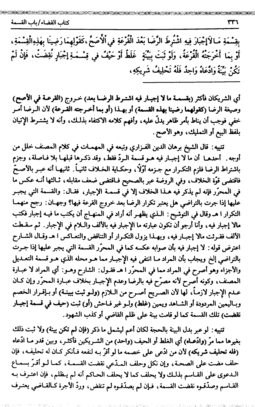 وَقَالَ الشَّارِحُ اُعْتُرِضَ قَوْلُهُ: لَا إجْبَارَ فِيهِ بِأَنَّ صَوَابَهُ عَكْسُهُ كَمَا فِي الْمُحَرَّرِ الْقِسْمَةُ الَّتِي يُجْبَرُ عَلَيْهَا إذَا جَرَتْ بِالتَّرَاضِي إلَخْ وَيُجَابُ بِأَنَّ الْمُرَادَ مَا انْتَفَى فِيهِ الْإِجْبَارُ مِمَّا هُوَ مَحَلُّهُ الَّذِي هُوَ قِسْمَةُ التَّعْدِيلِ وَالْأَجْزَاءِ وَهُوَ أَصَرْحُ فِي الْمُرَادِ مِمَّا فِي الْمُحَرَّرِ اهـ.