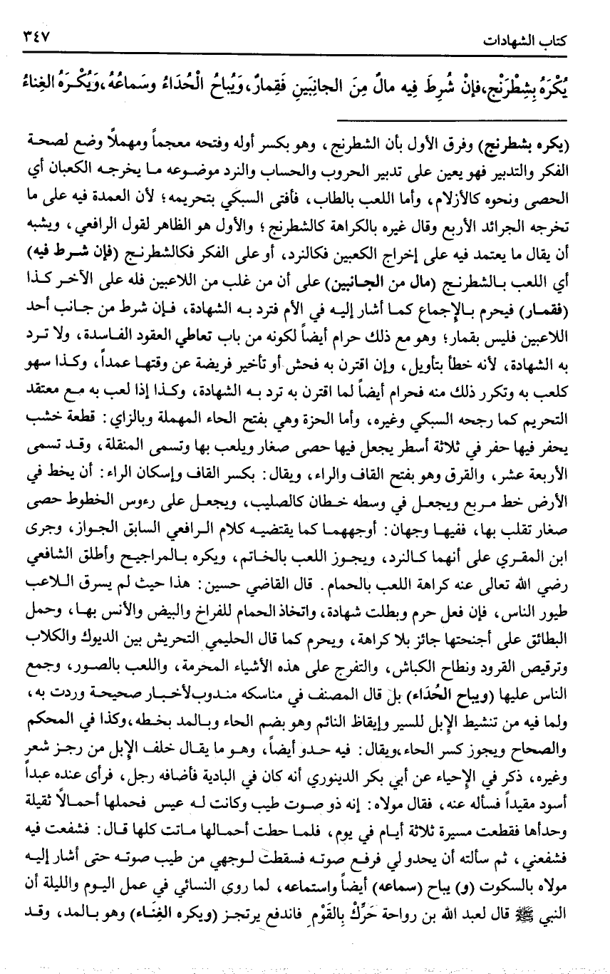 ـــــــــــــــــــــــــــــQ (يُكْرَهُ بِشِطْرَنْجٍ) وَفَرَّقَ الْأَوَّلَ بِأَنَّ الشِّطْرَنْجَ، وَهُوَ بِكَسْرِ أَوَّلِهِ وَفَتْحِهِ مُعْجَمًا وَمُهْمَلًا وُضِعَ لِصِحَّةِ الْفِكْرِ وَالتَّدْبِيرِ فَهُوَ يُعِينُ عَلَى تَدْبِيرِ الْحُرُوبِ وَالْحِسَابِ وَالنَّرْدُ مَوْضُوعُهُ مَا يُخْرِجُهُ الْكَعْبَانِ أَيْ الْحَصَى وَنَحْوُهُ كَالْأَزْلَامِ، وَأَمَّا اللَّعِبُ بِالطَّابِ، فَأَفْتَى السُّبْكِيُّ بِتَحْرِيمِهِ؛ لِأَنَّ الْعُمْدَةَ فِيهِ عَلَى مَا تُخْرِجُهُ الْجَرَائِدُ الْأَرْبَعُ وَقَالَ غَيْرُهُ بِالْكَرَاهَةِ كَالشِّطْرَنْجِ؛ وَالْأَوَّلُ هُوَ الظَّاهِرُ لِقَوْلِ الرَّافِعِيِّ، وَيُشْبِهُ أَنْ يُقَالَ مَا يُعْتَمَدُ فِيهِ عَلَى إخْرَاجِ الْكَعْبَيْنِ فَكَالنَّرْدِ، أَوْ عَلَى الْفِكْرِ فَكَالشِّطْرَنْجِ (فَإِنْ) (شُرِطَ فِيهِ) أَيْ اللَّعِبِ بِالشِّطْرَنْجِ (مَالٌ مِنْ الْجَانِبَيْنِ) عَلَى أَنَّ مَنْ غَلَبَ مِنْ اللَّاعِبَيْنِ فَلَهُ عَلَى الْآخَرِ كَذَا (فَقِمَارٌ) فَيَحْرُمُ بِالْإِجْمَاعِ كَمَا أَشَارَ إلَيْهِ فِي الْأُمِّ فَتُرَدُّ بِهِ الشَّهَادَةُ، فَإِنْ شُرِطَ مِنْ جَانِبِ أَحَدِ اللَّاعِبَيْنِ فَلَيْسَ بِقِمَارٍ؛ وَهُوَ مَعَ ذَلِكَ حَرَامٌ أَيْضًا لِكَوْنِهِ مِنْ بَابِ تَعَاطِي الْعُقُودِ الْفَاسِدَةِ، وَلَا تُرَدُّ بِهِ الشَّهَادَةُ؛ لِأَنَّهُ خَطَأٌ بِتَأْوِيلٍ، وَإِنْ اقْتَرَنَ بِهِ فُحْشٌ أَوْ تَأْخِيرُ فَرِيضَةٍ عَنْ وَقْتِهَا عَمْدًا، وَكَذَا سَهْوًا كَلَعِبٍ بِهِ وَتَكَرَّرَ ذَلِكَ مِنْهُ فَحَرَامٌ أَيْضًا لِمَا اقْتَرَنَ بِهِ تُرَدُّ بِهِ الشَّهَادَةُ، وَكَذَا إذَا لَعِبَ بِهِ مَعَ مُعْتَقِدِ التَّحْرِيمِ كَمَا رَجَّحَهُ السُّبْكِيُّ وَغَيْرُهُ.