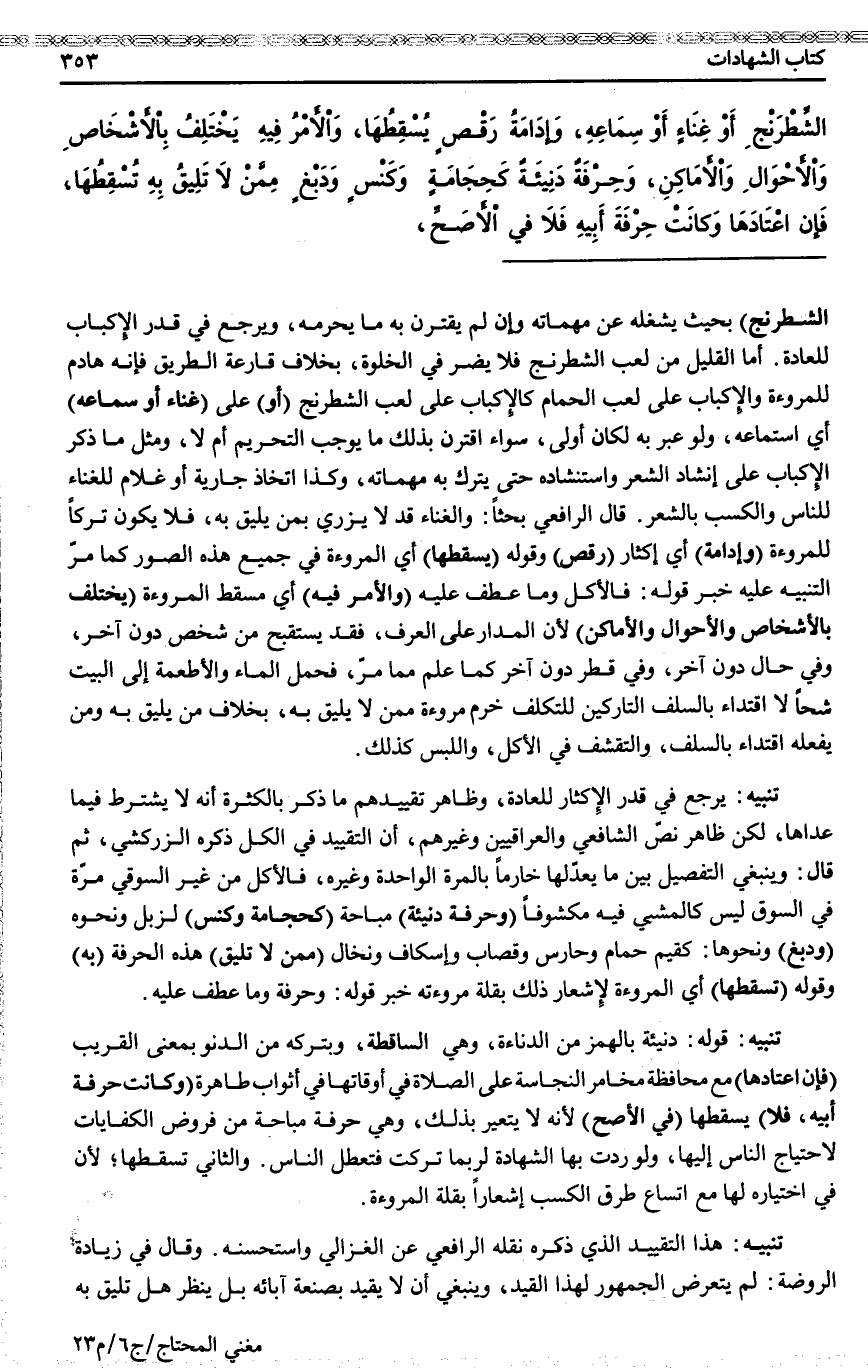 الشِّطْرَنْجِ أَوْ غِنَاءٍ أَوْ سَمَاعِهِ، وَإِدَامَةُ رَقْصٍ يُسْقِطُهَا، وَالْأَمْرُ فِيهِ يَخْتَلِفُ بِالْأَشْخَاصِ وَالْأَحْوَالِ وَالْأَمَاكِنِ، وَحِرْفَةٌ دَنِيئَةٌ كَحِجَامَةٍ وَكَنْسٍ وَدَبْغٍ مِمَّنْ لَا تَلِيقُ بِهِ تُسْقِطُهَا، فَإِنْ اعْتَادَهَا وَكَانَتْ حِرْفَةَ أَبِيهِ فَلَا فِي الْأَصَحِّ.