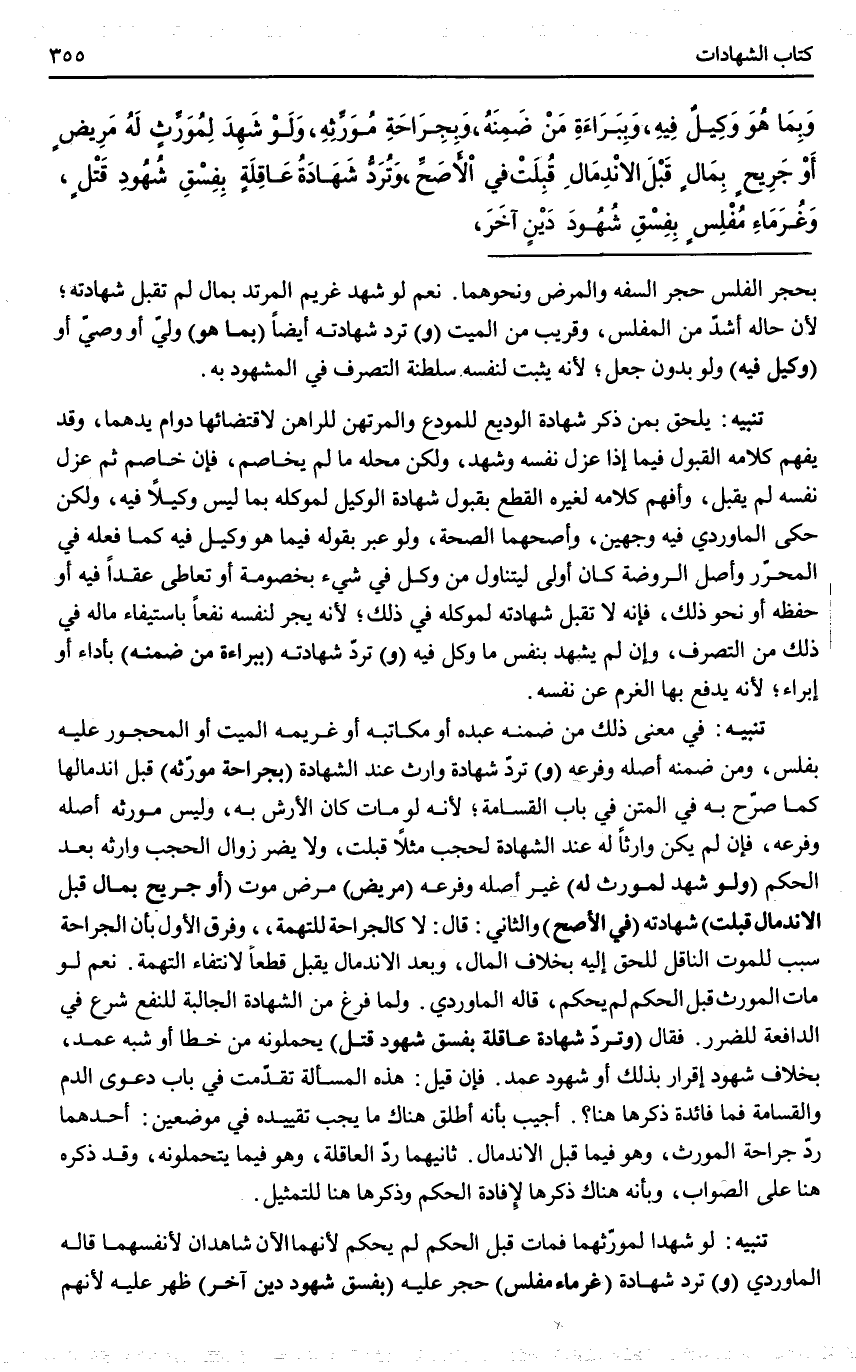 ـــــــــــــــــــــــــــــQبِحَجْرِ الْفَلَسِ حَجْرُ السَّفَهِ وَالْمَرَضِ وَنَحْوِهِمَا. نَعَمْ لَوْ شَهِدَ غَرِيمُ الْمُرْتَدِّ بِمَالٍ لَمْ تُقْبَلْ شَهَادَتُهُ؛ لِأَنَّ أَشَدُّ مِنْ الْمُفْلِسِ، وَقَرِيبٌ مِنْ الْمَيِّتِ (وَ) تُرَدُّ شَهَادَتُهُ أَيْضًا (بِمَا هُوَ) وَلِيٌّ أَوْ وَصِيٌّ أَوْ (وَكِيلٌ فِيهِ) وَلَوْ بِدُونِ جُعْلٍ؛ لِأَنَّهُ يُثْبِتُ لِنَفْسِهِ سَلْطَنَةَ التَّصَرُّفِ فِي الْمَشْهُودِ بِهِ.