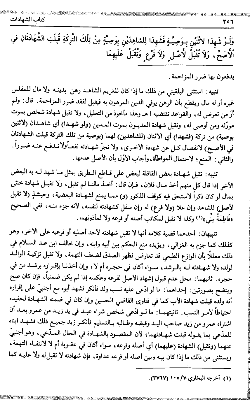 ثَانِيهِمَا: مَحَلُّ عَدَمِ قَبُولِ إشْهَادِ الْأَصْلِ لَفَرْعِهِ وَعَكْسِهِ إذَا لَمْ يَكُنْ ضِمْنِيًّا، فَإِنْ كَانَ صَحَّ وَيَتَّضِحُ بِصُورَتَيْنِ: إحْدَاهُمَا: مَا لَوْ ادَّعَى عَلَيْهِ نَسَبَ وَلَدٍ فَأَنْكَرَ فَشَهِدَ أَبُوهُ مَعَ أَجْنَبِيٍّ عَلَى إقْرَارِهِ أَنَّهُ وَلَدُهُ قُبِلَتْ شَهَادَةُ الْأَبِ كَمَا فِي فَتَاوَى الْقَاضِي الْحُسَيْنِ وَإِنْ كَانَ فِي ضِمْنِهِ الشَّهَادَةُ لِحَفِيدِهِ احْتِيَاطًا لِأَمْرِ النَّسَبِ. ثَانِيَتُهُمَا: مَا لَوْ ادَّعَى شَخْصٌ شِرَاءَ عَبْدٍ فِي يَدِ زَيْدٍ مِنْ عَمْرٍو بَعْدَ أَنْ اشْتَرَاهُ عَمْرٌو مِنْ زَيْدٍ صَاحِبِ الْيَدِ وَقَبَضَهُ وَطَالَبَهُ بِالتَّسْلِيمِ فَأَنْكَرَ زَيْدٌ جَمِيعَ ذَلِكَ فَشَهِدَ ابْنَاهُ لِلْمُدَّعِي بِمَا يَقُولُهُ قُبِلَتْ شَهَادَتُهُمَا؛ لِأَنَّ الْمَقْصُودَ بِالشَّهَادَةِ فِي الْحَالِ الْمُدَّعِي، وَهُوَ أَجْنَبِيٌّ عَنْهُمَا.