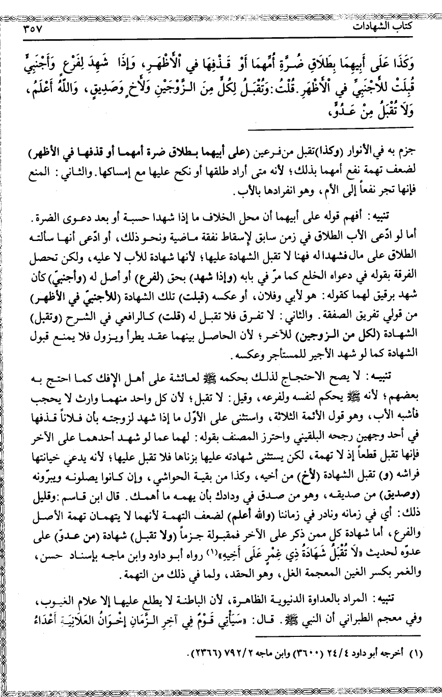(وَلَا تُقْبَلُ) شَهَادَةٌ (مِنْ عَدُوٍّ) عَلَى عَدُوِّهِ لِحَدِيثِ «لَا تُقْبَلُ شَهَادَةُ ذِي غِمْرٍ عَلَى أَخِيهِ» رَوَاهُ أَبُو دَاوُد وَابْنُ مَاجَهْ بِإِسْنَادٍ حَسَنٍ وَالْغِمْرُ بِكَسْرِ الْغَيْنِ الْمُعْجَمَةِ الْغِلُّ، وَهُوَ الْحِقْدُ، وَلِمَا فِي ذَلِكَ مِنْ التُّهْمَةِ
