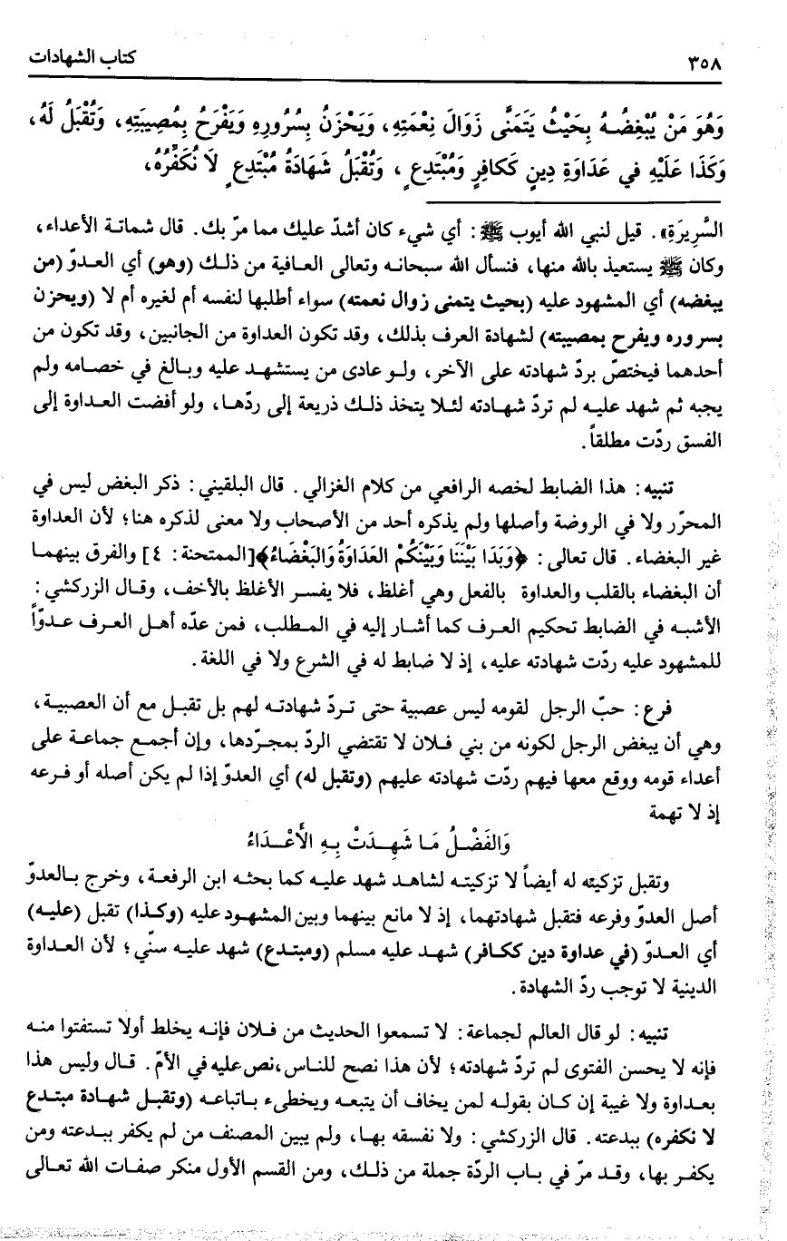 ـــــــــــــــــــــــــــــQقِيلَ لِنَبِيِّ اللَّهِ أَيُّوبَ - صَلَّى اللَّهُ عَلَيْهِ وَسَلَّمَ -: أَيُّ شَيْءٍ كَانَ أَشَدَّ عَلَيْك مِمَّا مَرَّ بِك. قَالَ شَمَاتَةُ الْأَعْدَاءِ، وَكَانَ - صَلَّى اللَّهُ عَلَيْهِ وَسَلَّمَ - يَسْتَعِيذُ بِاَللَّهِ مِنْهَا، فَنَسْأَلُ اللَّهَ سُبْحَانَهُ وَتَعَالَى الْعَافِيَةَ مِنْ ذَلِكَ (وَهُوَ) أَيْ الْعَدُوُّ (مَنْ يُبْغِضُهُ) أَيْ الْمَشْهُودُ عَلَيْهِ (بِحَيْثُ يَتَمَنَّى زَوَالَ نِعْمَتِهِ) سَوَاءٌ أَطَلَبَهَا لِنَفْسِهِ أَمْ لِغَيْرِهِ أَمْ لَا (وَيَحْزَنُ بِسُرُورِهِ وَيَفْرَحُ بِمُصِيبَتِهِ) لِشَهَادَةِ الْعُرْفِ بِذَلِكَ، وَقَدْ تَكُونُ الْعَدَاوَةُ مِنْ الْجَانِبَيْنِ، وَقَدْ تَكُونُ مِنْ أَحَدِهِمَا فَيُخْتَصُّ بِرَدِّ شَهَادَتِهِ عَلَى الْآخَرِ، وَلَوْ عَادَى مَنْ يُسْتَشْهَدُ عَلَيْهِ وَبَالَغَ فِي خِصَامِهِ وَلَمْ يُجِبْهُ ثُمَّ شَهِدَ عَلَيْهِ لَمْ تُرَدَّ شَهَادَتُهُ لِئَلَّا يُتَّخَذَ ذَلِكَ ذَرِيعَةً إلَى رَدِّهَا، وَلَوْ أَفْضَتْ الْعَدَاوَةُ إلَى الْفِسْقِ رُدَّتْ مُطْلَقًا.