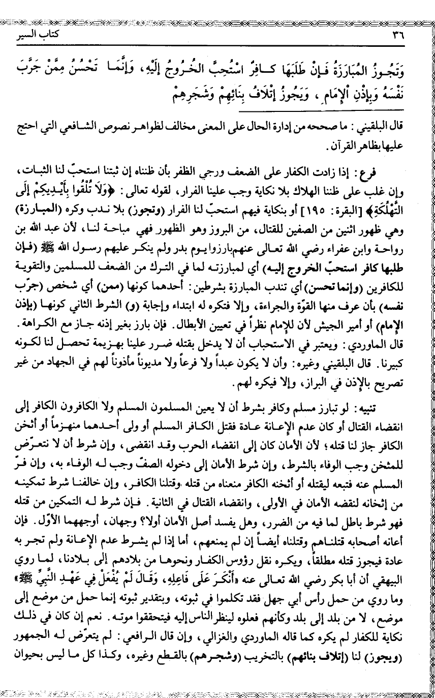 تَنْبِيهٌ لَوْ تَبَارَزَ مُسْلِمٌ وَكَافِرٌ بِشَرْطِ أَنْ لَا يُعِينَ الْمُسْلِمُونَ الْمُسْلِمَ وَلَا الْكَافِرُونَ الْكَافِرَ إلَى انْقِضَاءِ الْقِتَالِ أَوْ كَانَ عَدَمُ الْإِعَانَةِ عَادَةً فَقَتَلَ الْكَافِرُ الْمُسْلِمَ أَوْ وَلَّى أَحَدُهُمَا مُنْهَزِمًا أَوْ أُثْخِنَ الْكَافِرُ جَازَ لَنَا قَتْلُهُ؛ لِأَنَّ الْأَمَانَ كَانَ إلَى انْقِضَاءِ الْحَرْبِ وَقَدْ انْقَضَى، وَإِنْ شُرِطَ أَنْ لَا نَتَعَرَّضَ لِلْمُثْخَنِ وَجَبَ الْوَفَاءُ بِالشَّرْطِ، وَإِنْ شُرِطَ الْأَمَانُ إلَى دُخُولِهِ الصَّفَّ وَجَبَ لَهُ الْوَفَاءُ بِهِ، وَإِنْ فَرَّ الْمُسْلِمُ عَنْهُ فَتَبِعَهُ لِيَقْتُلَهُ أَوْ أَثْخَنَهُ الْكَافِرُ مَنَعْنَاهُ مِنْ قَتْلِهِ. وَقَتَلْنَا الْكَافِرَ، وَإِنْ خَالَفْنَا شَرْطَ تَمْكِينِهِ مِنْ إثْخَانِهِ لِنَقْضِهِ الْأَمَانَ فِي الْأُولَى، وَانْقِضَاءِ الْقِتَالِ فِي الثَّانِيَةِ. فَإِنْ شُرِطَ لَهُ التَّمْكِينُ مِنْ قَتْلِهِ فَهُوَ شَرْطٌ بَاطِلٌ لِمَا فِيهِ مِنْ الضَّرَرِ، وَهَلْ يَفْسُدُ أَصْلُ الْأَمَانِ أَوْ لَا؟ وَجْهَانِ، أَوْجَهُهُمَا الْأَوَّلُ. فَإِنْ أَعَانَهُ أَصْحَابُهُ قَتَلْنَاهُمْ وَقَتَلْنَاهُ أَيْضًا إنْ لَمْ يَمْنَعْهُمْ، أَمَّا إذَا لَمْ يَشْرِطْ عَدَمَ الْإِعَانَةِ وَلَمْ تَجْرِ بِهِ عَادَةٌ فَيَجُوزُ قَتْلُهُ مُطْلَقًا، وَيُكْرَهُ نَقْلُ رُءُوسِ الْكُفَّارِ وَنَحْوِهَا مِنْ بِلَادِهِمْ إلَى بِلَادِنَا، لِمَا رَوَى الْبَيْهَقِيُّ أَنَّ أَبَا بَكْرٍ - رَضِيَ اللَّهُ تَعَالَى عَنْهُ - " أَنْكَرَ عَلَى فَاعِلِهِ، وَقَالَ: لَمْ يَفْعَلْ فِي عَهْدِ النَّبِيِّ - صَلَّى اللَّهُ عَلَيْهِ وَسَلَّمَ - " وَمَا رُوِيَ مِنْ حَمْلِ رَأْسِ أَبِي جَهْلٍ فَقَدْ تَكَلَّمُوا فِي ثُبُوتِهِ، وَبِتَقْدِيرِ ثُبُوتِهِ إنَّمَا حُمِلَ مِنْ مَوْضِعٍ إلَى مَوْضِعٍ، لَا مِنْ بَلَدٍ إلَى بَلَدٍ وَكَأَنَّهُمْ فَعَلُوهُ لِيَنْظُرَ النَّاسَ إلَيْهِ فَيَتَحَقَّقُوا مَوْتَهُ. نَعَمْ إنْ كَانَ فِي ذَلِكَ نِكَايَةٌ لِلْكُفَّارِ لَمْ يُكْرَهْ كَمَا قَالَهُ: الْمَاوَرْدِيُّ وَالْغَزَالِيّ، وَإِنْ قَالَ: الرَّافِعِيُّ: لَمْ يَتَعَرَّضْ لَهُ الْجُمْهُورُ.