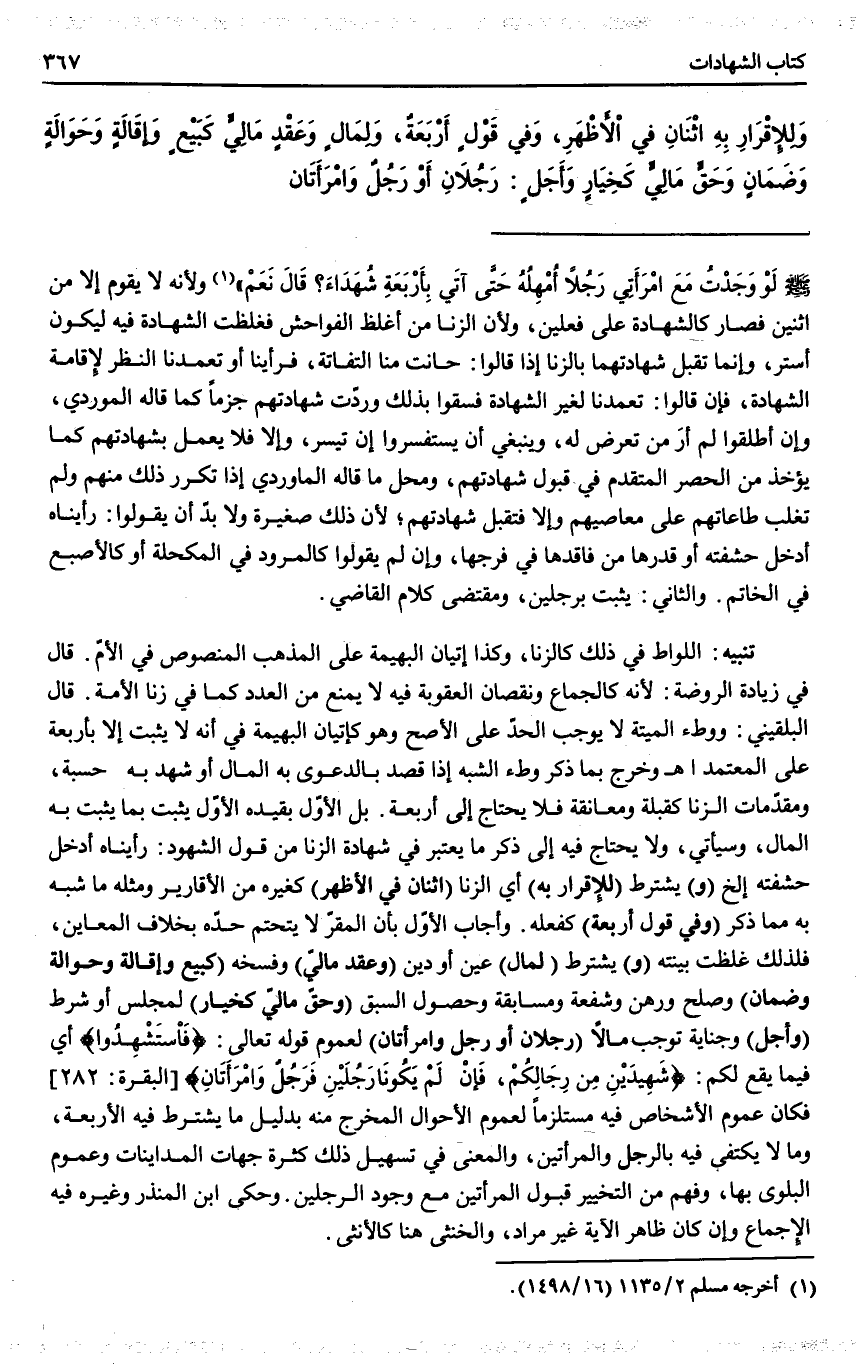 وَلَلْإِقْرَارِ بِهِ اثْنَانِ فِي الْأَظْهَرِ، وَفِي قَوْلٍ أَرْبَعَةٌ، وَلِمَالٍ وَعَقْدٍ مَالِيٍّ كَبَيْعٍ وَإِقَالَةٍ وَحَوَالَةٍ وَضَمَانٍ وَحَقٍّ مَالِيٍّ كَخِيَارٍ وَأَجَلٍ: رَجُلَانِ أَوْ رَجُلٌ وَامْرَأَتَانِ