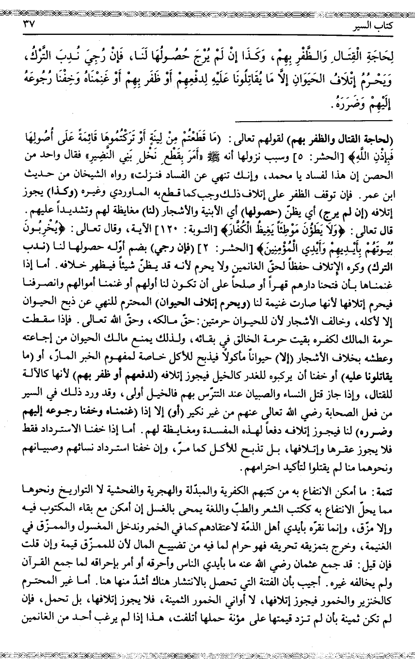 ـــــــــــــــــــــــــــــQ (لِحَاجَةِ الْقِتَالِ وَالظَّفَرِ بِهِمْ) لِقَوْلِهِ تَعَالَى: {مَا قَطَعْتُمْ مِنْ لِينَةٍ أَوْ تَرَكْتُمُوهَا قَائِمَةً عَلَى أُصُولِهَا فَبِإِذْنِ اللَّهِ} [الحشر: 5] وَسَبَبُ نُزُولِهَا «أَنَّهُ - صَلَّى اللَّهُ عَلَيْهِ وَسَلَّمَ - أَمَرَ بِقَطْعِ نَخْلِ بَنِي النَّضِيرِ. فَقَالَ: وَاحِدٌ مِنْ الْحِصْنِ إنَّ هَذَا لَفَسَادٌ يَا مُحَمَّدُ، وَإِنَّكَ تَنْهَى عَنْ الْفَسَادِ فَنَزَلَتْ» رَوَاهُ الشَّيْخَانِ مِنْ حَدِيثِ ابْنِ عُمَرَ. فَإِنْ تَوَقَّفَ الظَّفَرُ عَلَى إتْلَافِ ذَلِكَ وَجَبَ كَمَا قَطَعَ بِهِ الْمَاوَرْدِيُّ وَغَيْرُهُ (وَكَذَا) يَجُوزُ إتْلَافُهُ (إنْ لَمْ يُرْجَ) أَيْ يُظَنُّ (لَهَا) أَيْ الْأَبْنِيَةِ وَالْأَشْجَارِ (لَنَا) مُغَايَظَةً لَهُمْ وَتَشْدِيدًا عَلَيْهِمْ قَالَ: تَعَالَى: {وَلا يَطَئُونَ مَوْطِئًا يَغِيظُ الْكُفَّارَ} [التوبة: 120] الْآيَةَ، وَقَالَ تَعَالَى: {يُخْرِبُونَ بُيُوتَهُمْ بِأَيْدِيهِمْ وَأَيْدِي الْمُؤْمِنِينَ} [الحشر: 2] (فَإِنْ رُجِيَ) بِضَمِّ أَوَّلِهِ حُصُولُهَا لَنَا (نُدِبَ التَّرْكُ) وَكُرِهَ الْإِتْلَافُ حِفْظًا لِحَقِّ الْغَانِمِينَ وَلَا يَحْرُمُ؛ لِأَنَّهُ قَدْ يَظُنُّ شَيْئًا فَيَظْهَرُ خِلَافُهُ. أَمَّا إذَا غَنِمْنَاهَا بِأَنْ فَتَحْنَا دَارَهُمْ قَهْرًا وَصُلْحًا عَلَى أَنْ تَكُونَ لَنَا أَوْ لَهُمْ أَوْ غَنِمْنَا أَمْوَالَهُمْ وَانْصَرَفْنَا فَيَحْرُمُ إتْلَافُهَا؛ لِأَنَّهَا صَارَتْ غَنِيمَةً لَنَا.