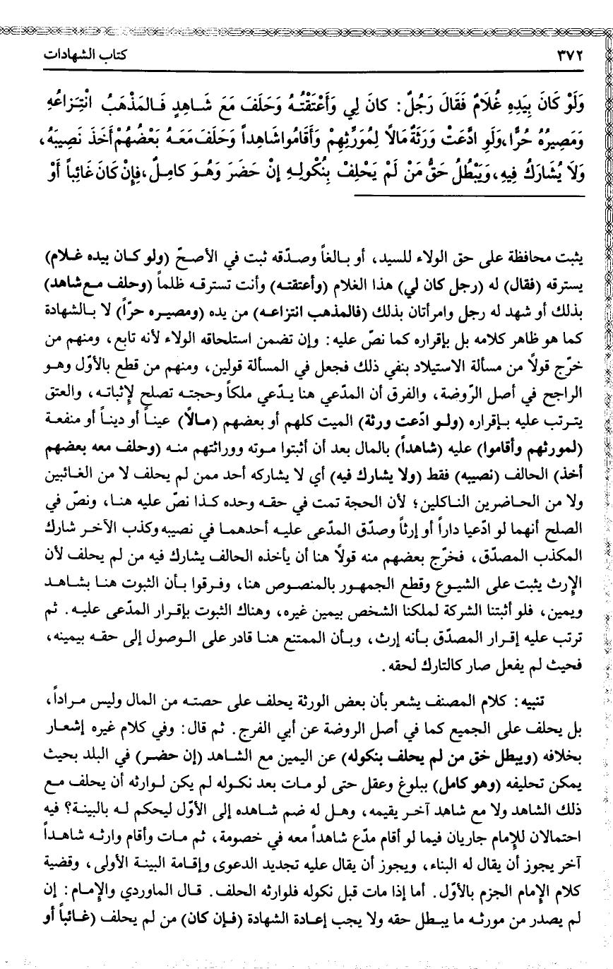 تَنْبِيهٌ: كَلَامُ الْمُصَنِّفِ يُشْعِرُ بِأَنَّ بَعْضَ الْوَرَثَةِ يَحْلِفُ عَلَى حِصَّتِهِ مِنْ الْمَالِ وَلَيْسَ مُرَادًا، بَلْ يَحْلِفُ عَلَى الْجَمِيعِ كَمَا فِي أَصْلِ الرَّوْضَةِ عَنْ أَبِي الْفَرَجِ. ثُمَّ قَالَ: وَفِي كَلَامِ غَيْرِهِ إشْعَارٌ بِخِلَافِهِ (وَيَبْطُلُ حَقُّ مَنْ لَمْ يَحْلِفْ بِنُكُولِهِ) عَنْ الْيَمِينِ مَعَ الشَّاهِدِ (إنْ حَضَرَ) فِي الْبَلَدِ بِحَيْثُ يُمْكِنُ تَحْلِيفُهُ (وَهُوَ كَامِلٌ) بِبُلُوغٍ وَعَقْلٍ حَتَّى لَوْ مَاتَ بَعْدَ نُكُولِهِ لَمْ يَكُنْ لِوَارِثِهِ أَنْ يَحْلِفَ مَعَ ذَلِكَ الشَّاهِدِ وَلَا مَعَ شَاهِدٍ آخَرَ يُقِيمُهُ، وَهَلْ لَهُ ضَمُّ شَاهِدِهِ إلَى الْأَوَّلِ لِيُحْكَمَ لَهُ بِالْبَيِّنَةِ؟ فِيهِ احْتِمَالَانِ لِلْإِمَامِ جَارِيَانِ فِيمَا لَوْ أَقَامَ مُدَّعٍ شَاهِدًا مَعَهُ فِي خُصُومَةٍ، ثُمَّ مَاتَ وَأَقَامَ وَارِثُهُ شَاهِدًا آخَرَ يَجُوزُ أَنْ يُقَالَ لَهُ الْبِنَاءُ، وَيَجُوزُ أَنْ يُقَالَ عَلَيْهِ تَجْدِيدُ الدَّعْوَى وَإِقَامَةُ الْبَيِّنَةِ الْأُولَى، وَقَضِيَّةُ كَلَامِ الْإِمَامِ الْجَزْمُ بِالْأَوَّلِ. أَمَّا إذَا مَاتَ قَبْلَ نُكُولِهِ فَلِوَارِثِهِ الْحَلِفُ. قَالَ الْمَاوَرْدِيُّ وَالْإِمَامُ: إنْ لَمْ يَصْدُرْ مِنْ مُورِثِهِ مَا يُبْطِلُ حَقَّهُ وَلَا يَجِبُ إعَادَةُ الشَّهَادَةِ (فَإِنْ كَانَ) مَنْ لَمْ يَحْلِفْ (غَائِبًا أَوْ