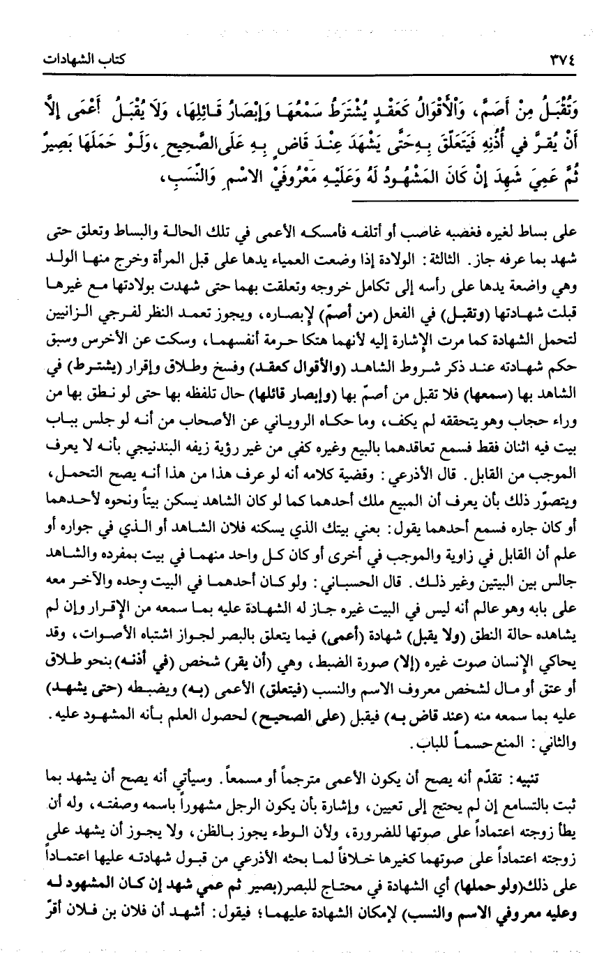 (وَتُقْبَلُ) فِي الْفِعْلِ (مِنْ أَصَمَّ) لِإِبْصَارِهِ، وَيَجُوزُ تَعَمُّدُ النَّظَرِ لِفَرْجَيْ الزَّانِيَيْنِ لِتَحَمُّلِ الشَّهَادَةِ كَمَا مَرَّتْ الْإِشَارَةُ إلَيْهِ؛ لِأَنَّهُمَا هَتَكَا حُرْمَةَ أَنْفُسِهِمَا، وَسَكَتَ عَنْ الْأَخْرَسِ وَسَبَقَ حُكْمُ شَهَادَتِهِ عِنْدَ ذِكْرِ شُرُوطِ الشَّاهِدِ (وَالْأَقْوَالُ كَعَقْدٍ) وَفَسْخٍ وَطَلَاقٍ وَإِقْرَارٍ (يُشْتَرَطُ) فِي الشَّاهِدِ بِهَا (سَمْعُهَا) فَلَا تُقْبَلُ مِنْ أَصَمَّ بِهَا (وَإِبْصَارُ قَائِلِهَا) حَالَ تَلَفُّظِهِ بِهَا حَتَّى لَوْ نَطَقَ بِهَا مِنْ وَرَاءِ حِجَابٍ وَهُوَ يَتَحَقَّقُهُ لَمْ يَكْفِ، وَمَا حَكَاهُ الرُّويَانِيُّ عَنْ الْأَصْحَابِ مِنْ أَنَّهُ لَوْ جَلَسَ بِبَابِ بَيْتٍ فِيهِ اثْنَانِ فَقَطْ فَسَمِعَ تَعَاقُدَهُمَا بِالْبَيْعِ وَغَيْرِهِ كَفَى مِنْ غَيْرِ رُؤْيَةٍ، زَيَّفَهُ الْبَنْدَنِيجِيُّ بِأَنَّهُ لَا يَعْرِفُ الْمُوجِبَ مِنْ الْقَابِلِ. قَالَ الْأَذْرَعِيُّ: وَقَضِيَّةُ كَلَامِهِ أَنَّهُ لَوْ عَرَفَ هَذَا مِنْ هَذَا أَنَّهُ يَصِحُّ التَّحَمُّلُ، وَيُتَصَوَّرُ ذَلِكَ بِأَنْ يَعْرِفَ أَنَّ الْمَبِيعَ مِلْكُ أَحَدِهِمَا كَمَا لَوْ كَانَ الشَّاهِدُ يَسْكُنُ بَيْتًا وَنَحْوَهُ لِأَحَدِهِمَا أَوْ كَانَ جَارَهُ فَسَمِعَ أَحَدَهُمَا يَقُولُ: بِعْنِي بَيْتَك الَّذِي يَسْكُنُهُ فُلَانٌ الشَّاهِدُ أَوْ الَّذِي فِي جِوَارِهِ أَوْ عَلِمَ أَنَّ الْقَابِلَ فِي زَاوِيَةٍ وَالْمُوجِبَ فِي أُخْرَى أَوْ كَانَ كُلُّ وَاحِدٍ مِنْهُمَا فِي بَيْتٍ بِمُفْرَدِهِ وَالشَّاهِدُ جَالِسٌ بَيْنَ الْبَيْتَيْنِ وَغَيْرَ ذَلِكَ.