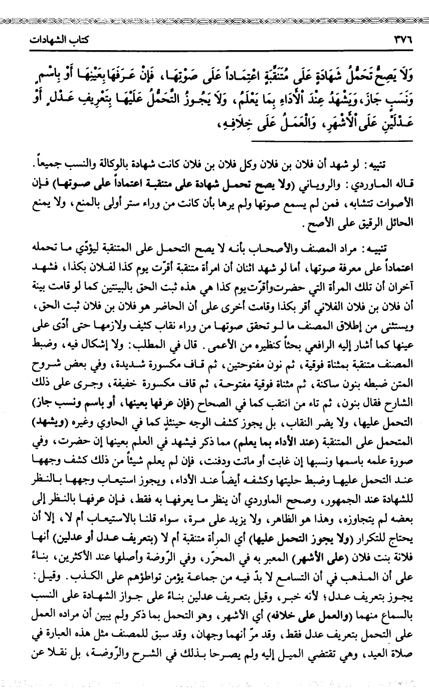 وَلَا يَصِحُّ تَحَمُّلُ شَهَادَةٍ عَلَى مُتَنَقِّبَةٍ اعْتِمَادًا عَلَى صَوْتِهَا، فَإِنْ عَرَفَهَا بِعَيْنِهَا أَوْ بِاسْمٍ وَنَسَبٍ جَازَ، وَيَشْهَدُ عِنْدَ الْأَدَاءِ بِمَا يَعْلَمُ، وَلَا يَجُوزُ التَّحَمُّلُ عَلَيْهَا بِتَعْرِيفِ عَدْلٍ أَوْ عَدْلَيْنِ عَلَى الْأَشْهَرِ، وَالْعَمَلُ عَلَى خِلَافِهِ،