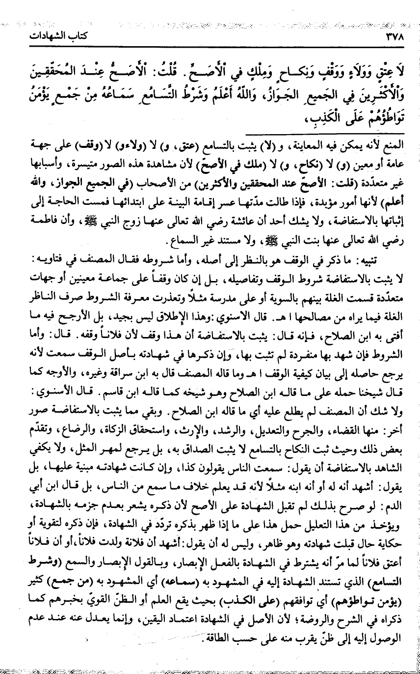 لَا عِتْقٌ وَوَلَاءُ وَوَقْفٌ وَنِكَاحٌ وَمِلْكٌ فِي الْأَصَحِّ. قُلْتُ: الْأَصَحُّ عِنْدَ الْمُحَقِّقِينَ وَالْأَكْثَرِينَ فِي الْجَمِيعِ الْجَوَازُ، وَاَللَّهُ أَعْلَمُ وَشَرْطُ التَّسَامُعِ سَمَاعُهُ مِنْ جَمْعٍ يُؤْمَنُ تَوَاطُؤُهُمْ عَلَى الْكَذِبِ،