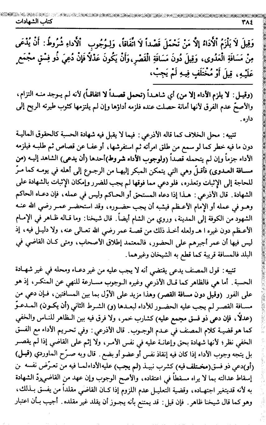 تَنْبِيهٌ: قَوْلُ الْمُصَنِّفِ يُدْعَى يَقْتَضِي أَنَّهُ لَا يَجِبُ عَلَيْهِ مِنْ غَيْرِ دُعَاءٍ وَمَحَلُّهُ فِي غَيْرِ شَهَادَةِ الْحِسْبَةِ. أَمَّا هِيَ فَالظَّاهِرُ كَمَا قَالَ الْأَذْرَعِيُّ وَغَيْرُهُ الْوُجُوبُ مُسَارَعَةً لِلنَّهْيِ عَنْ الْمُنْكَرِ، إذْ هُوَ عَلَى الْفَوْرِ (وَقِيلَ دُونَ مَسَافَةِ الْقَصْرِ) وَهَذَا مَزِيدٌ عَلَى الْأَوَّلِ بِمَا بَيْنَ الْمَسَافَتَيْنِ، فَإِنْ دُعِيَ مِنْ مَسَافَةِ الْقَصْرِ لَمْ يَجِبْ عَلَيْهِ الْحُضُورُ لِلْأَدَاءِ لِبُعْدِهَا (وَ) الشَّرْطُ الثَّانِي (أَنْ يَكُونَ) الْمَدْعُوُّ (عَدْلًا، فَإِنْ دُعِيَ ذُو فِسْقٍ مُجْمَعٍ عَلَيْهِ) كَشَارِبِ خَمْرٍ، وَلَا فَرْقَ فِيهِ بَيْنَ الظَّاهِرِ لِلنَّاسِ وَالْخَفِيِّ كَمَا هُوَ قَضِيَّةُ كَلَامِ الْمُصَنِّفِ فِي عَدَمِ الْوُجُوبِ. قَالَ الْأَذْرَعِيُّ: وَفِي تَحْرِيمِ الْأَدَاءِ مَعَ الْفِسْقِ الْخَفِيِّ نَظَرٌ؛ لِأَنَّهَا شَهَادَةٌ بِحَقٍّ وَإِعَانَةٌ عَلَيْهِ فِي نَفْسِ الْأَمْرِ، وَلَا إثْمَ عَلَى الْقَاضِي إذَا لَمْ يُقَصِّرْ بَلْ يَتَّجِهُ وُجُوبُ الْأَدَاءِ إذَا كَانَ فِيهِ إنْقَاذُ نَفْسٍ أَوْ عُضْوٍ أَوْ بُضْعٍ. قَالَ وَبِهِ صَرَّحَ الْمَاوَرْدِيُّ (قِيلَ) (أَوْ) دُعِيَ ذُو فِسْقٍ (مُخْتَلَفٍ فِيهِ) كَشُرْبِ نَبِيذٍ (لَمْ يَجِبْ) عَلَيْهِ الْأَدَاءُ لِمَا فِيهِ مِنْ تَعَرُّضِ نَفْسِهِ مِنْ إسْقَاطِ عَدَالَتِهِ بِمَا لَا يَرَاهُ مُسْقِطًا فِي اعْتِقَادِهِ، وَالْأَصَحُّ الْوُجُوبُ وَإِنْ عُهِدَ مِنْ الْقَاضِي رَدُّ الشَّهَادَةِ بِهِ؛ لِأَنَّهُ قَدْ يَتَغَيَّرُ اجْتِهَادُهُ، وَقَضِيَّةُ التَّعْلِيلِ عَدَمُ اللُّزُومِ إذَا كَانَ الْقَاضِي مُقَلِّدًا مَنْ يُفَسِّقُ بِذَلِكَ، وَهُوَ كَمَا قَالَ شَيْخُنَا ظَاهِرٌ. فَإِنْ قِيلَ: قَدْ يَمْتَنِعُ بِأَنَّهُ يَجُوزُ أَنْ يُقَلِّدَ غَيْرَ مُقَلَّدِهِ.
