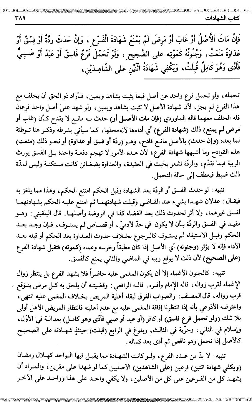 (وَإِنْ) (حَدَثَ) بِالْأَصْلِ مَانِعٌ قَادِحٌ، وَهُوَ (رِدَّةٌ أَوْ فِسْقٌ أَوْ عَدَاوَةٌ) أَوْ نَحْوُ ذَلِكَ (مَنَعَتْ) هَذِهِ الْقَوَادِحُ وَمَا أَشْبَهَهَا شَهَادَةَ الْفَرْعِ؛ لِأَنَّ هَذِهِ الْأُمُورَ لَا تَهْجُمُ دَفْعَةً وَاحِدَةً بَلْ الْفِسْقُ يُورِثُ الرِّيبَةَ فِيمَا تَقَدَّمَ، وَالرِّدَّةُ تُشْعِرُ بِخُبْثٍ فِي الْعَقِيدَةِ، وَالْعَدَاوَةُ بِضَغَائِنَ كَانَتْ مُسْتَكِنَّةً وَلَيْسَ لِمُدَّةِ ذَلِكَ ضَبْطٌ فَيُعْطَفُ إلَى حَالَةِ التَّحَمُّلِ.