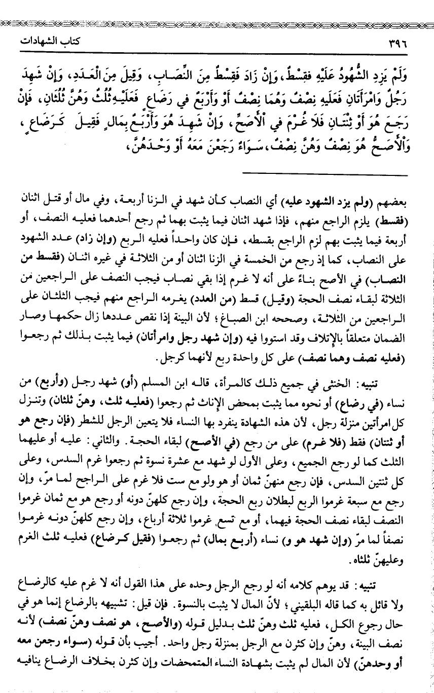 تَنْبِيهٌ: الْخُنْثَى فِي جَمِيعِ ذَلِكَ كَالْمَرْأَةِ، قَالَهُ ابْنُ الْمُسْلِمِ (أَوْ) شَهِدَ رَجُلٌ (وَأَرْبَعٌ) مِنْ نِسَاءٍ (فِي رَضَاعٍ) أَوْ نَحْوِهِ مِمَّا يَثْبُتُ بِمَحْضِ الْإِنَاثِ ثُمَّ رَجَعُوا (فَعَلَيْهِ ثُلُثٌ، وَهُنَّ ثُلُثَانِ) وَتَنْزِلُ كُلُّ امْرَأَتَيْنِ مَنْزِلَةَ رَجُلٍ؛ لِأَنَّ هَذِهِ الشَّهَادَةَ يَنْفَرِدُ بِهَا النِّسَاءُ فَلَا يَتَعَيَّنُ الرَّجُلُ لِلشَّطْرِ (فَإِنْ رَجَعَ هُوَ أَوْ ثِنْتَانِ) فَقَطْ (فَلَا غُرْمَ) عَلَى مَنْ رَجَعَ (فِي الْأَصَحِّ) لِبَقَاءِ الْحُجَّةِ. وَالثَّانِي: عَلَيْهِ أَوْ عَلَيْهِمَا الثُّلُثُ كَمَا لَوْ رَجَعَ الْجَمِيعُ، وَعَلَى الْأَوَّلِ لَوْ شَهِدَ مَعَ عَشْرَةِ نِسْوَةٍ ثُمَّ رَجَعُوا غَرِمَ السُّدُسَ، وَعَلَى كُلِّ ثِنْتَيْنِ السُّدُسُ، فَإِنْ رَجَعَ مِنْهُنَّ ثَمَانٍ أَوْ هُوَ وَلَوْ مَعَ سِتٍّ فَلَا غُرْمَ عَلَى الرَّاجِحِ لِمَا مَرَّ، وَإِنْ رَجَعَ مَعَ سَبْعَةٍ غَرِمُوا الرُّبُعَ لِبُطْلَانِ رُبُعِ الْحُجَّةِ، وَإِنْ رَجَعَ كُلُّهُنَّ دُونَهُ أَوْ رَجَعَ هُوَ مَعَ ثَمَانٍ غَرِمُوا النِّصْفَ لِبَقَاءِ نِصْفِ الْحُجَّةِ فِيهِمَا، أَوْ مَعَ تِسْعٍ غَرِمُوا ثَلَاثَةَ أَرْبَاعٍ، وَإِنْ رَجَعَ كُلُّهُنَّ دُونَهُ غَرِمُوا نِصْفًا لِمَا مَرَّ.