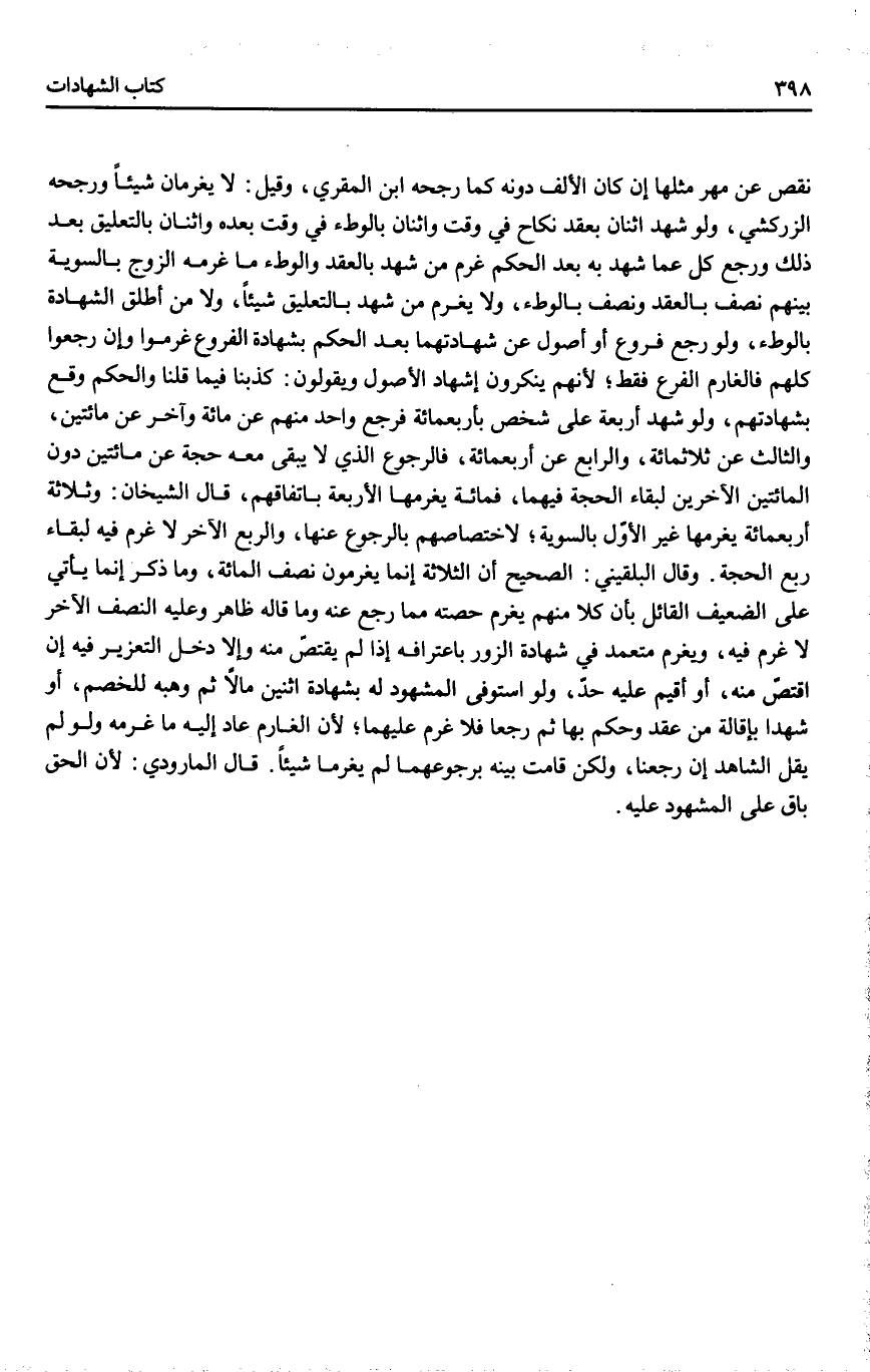 وَلَوْ شَهِدَ أَرْبَعَةٌ عَلَى شَخْصٍ بِأَرْبَعِمِائَةٍ فَرَجَعَ وَاحِدٌ مِنْهُمْ عَنْ مِائَةٍ وَآخَرُ عَنْ مِائَتَيْنِ، وَالثَّالِثُ عَنْ ثَلَاثِمِائَةٍ، وَالرَّابِعُ عَنْ أَرْبَعِمِائَةٍ، فَالرُّجُوعُ الَّذِي لَا يَبْقَى مَعَهُ حُجَّةٌ عَنْ مِائَتَيْنِ دُونَ الْمِائَتَيْنِ الْآخَرَيْنِ لِبَقَاءِ الْحُجَّةِ فِيهِمَا، فَمِائَةٌ يَغْرَمُهَا الْأَرْبَعَةُ بِاتِّفَاقِهِمْ، قَالَ الشَّيْخَانِ: وَثَلَاثَةُ أَرْبَعِمِائَةٍ يَغْرَمُهَا غَيْرُ الْأَوَّلِ بِالسَّوِيَّةِ؛ لِاخْتِصَاصِهِمْ بِالرُّجُوعِ عَنْهَا، وَالرُّبُعُ الْآخَرُ لَا غُرْمَ فِيهِ لِبَقَاءِ رُبُعِ الْحُجَّةِ. وَقَالَ الْبُلْقِينِيُّ: الصَّحِيحُ أَنَّ الثَّلَاثَةَ إنَّمَا يَغْرَمُونَ نِصْفَ الْمِائَةِ، وَمَا ذُكِرَ إنَّمَا يَأْتِي عَلَى الضَّعِيفِ الْقَائِلِ بِأَنَّ كُلًّا مِنْهُمْ يَغْرَمُ حِصَّتَهُ مِمَّا رَجَعَ عَنْهُ وَمَا قَالَهُ ظَاهِرٌ وَعَلَيْهِ النِّصْفُ الْآخَرُ لَا غُرْمَ فِيهِ، وَيَغْرَمُ مُتَعَمِّدٌ فِي شَهَادَةِ الزُّورِ بِاعْتِرَافِهِ إذَا لَمْ يُقْتَصَّ مِنْهُ وَإِلَّا دَخَلَ التَّعْزِيرُ فِيهِ إنْ اُقْتُصَّ مِنْهُ، أَوْ أُقِيمَ عَلَيْهِ حَدٌّ.