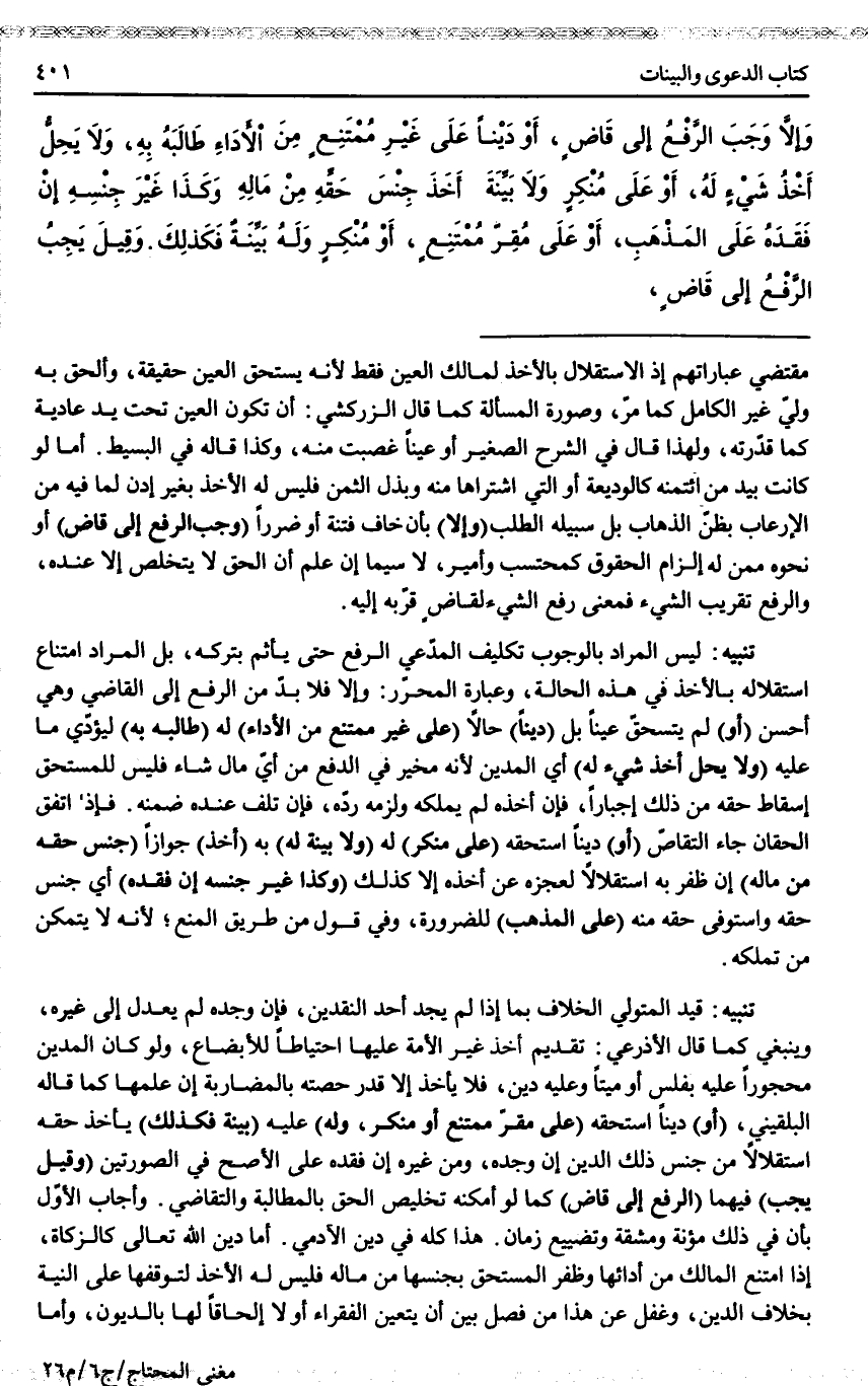 ـــــــــــــــــــــــــــــQمُقْتَضَى عِبَارَاتِهِمْ إذْ الِاسْتِقْلَالُ بِالْأَخْذِ لِمَالِكِ الْعَيْنِ فَقَطْ؛ لِأَنَّهُ يَسْتَحِقُّ الْعَيْنَ حَقِيقَةً، وَأُلْحِقَ بِهِ وَلِيُّ غَيْرِ الْكَامِلِ كَمَا مَرَّ، وَصُورَةُ الْمَسْأَلَةِ كَمَا قَالَ الزَّرْكَشِيُّ: أَنْ تَكُونَ الْعَيْنُ تَحْتَ يَدٍ عَادِيَةٍ كَمَا قَدَّرْتُهُ، وَلِهَذَا قَالَ فِي الشَّرْحِ الصَّغِيرِ أَوْ عَيْنًا غُصِبَتْ مِنْهُ، وَكَذَا قَالَهُ فِي الْبَسِيطِ أَمَّا لَوْ كَانَتْ بِيَدِ مَنْ ائْتَمَنَهُ كَالْوَدِيعَةِ أَوْ الَّتِي اشْتَرَاهَا مِنْهُ وَبَذَلَ الثَّمَنَ فَلَيْسَ لَهُ الْأَخْذُ بِغَيْرِ إذْنٍ لِمَا فِيهِ مِنْ الْإِرْعَابِ بِظَنِّ الذَّهَابِ بَلْ سَبِيلُهُ الطَّلَبُ (وَإِلَّا) بِأَنْ خَافَ فِتْنَةً أَوْ ضَرَرًا (وَجَبَ الرَّفْعُ إلَى قَاضٍ) أَوْ نَحْوِهِ مِمَّنْ لَهُ إلْزَامُ الْحُقُوقِ كَمُحْتَسِبٍ وَأَمِيرٍ، لَا سِيَّمَا إنْ عَلِمَ أَنَّ الْحَقَّ لَا يَتَخَلَّصُ إلَّا عِنْدَهُ، وَالرَّفْعُ تَقْرِيبُ الشَّيْءِ فَمَعْنَى رَفْعِ الشَّيْءِ لِقَاضٍ قُرْبُهُ إلَيْهِ.
