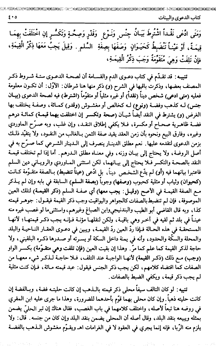 ـــــــــــــــــــــــــــــQتَنْبِيهٌ: قَدْ تَقَدَّمَ فِي كِتَابِ دَعْوَى الدَّمِ وَالْقَسَامَةِ أَنَّ لِصِحَّةِ الدَّعْوَى سِتَّةَ شُرُوطٍ ذَكَرَ الْمُصَنِّفُ بَعْضَهَا، وَذَكَرْت بَاقِيَهَا فِي الشَّرْحِ (وَ) ذُكِرَ مِنْهَا هُنَا شَرْطَانِ: الْأَوَّلُ: أَنْ تَكُونَ مَعْلُومَةً فَعَلَيْهِ (مَتَى) (ادَّعَى) شَخْصٌ دَيْنًا (نَقْدًا) أَوْ غَيْرَهُ مِثْلِيًّا أَوْ مُتَقَوِّمًا (اُشْتُرِطَ) فِيهِ لِصِحَّةِ الدَّعْوَى (بَيَانُ جِنْسٍ) لَهُ كَذَهَبٍ وَفِضَّةٍ (وَنَوْعٍ) لَهُ كَخَالِصٍ أَوْ مَغْشُوشٍ (وَقَدْرٍ) كَمِائَةٍ، وَصِفَةٍ يَخْتَلِفُ بِهَا الْغَرَضُ (وَ) يُشْتَرَطُ فِي النَّقْدِ أَيْضًا شَيْئَانِ (صِحَّةٌ وَتَكَسُّرٌ إنْ اخْتَلَفَتْ بِهِمَا قِيمَةُ) كَمِائَةِ دِرْهَمٍ فِضَّةٍ ظَاهِرِيَّةٍ صِحَاحٍ أَوْ مُكَسَّرَةٍ، فَلَا يَكْفِي إطْلَاقُ النَّقْدِ، وَإِنْ غَلَبَ، وَبِهِ صَرَّحَ الْمَاوَرْدِيُّ وَغَيْرُهُ، وَفَارَقَ الْبَيْعَ وَنَحْوَهُ بِأَنَّ زَمَنَ الْعَقْدِ يُقَيِّدُ صِفَةَ الثَّمَنِ بِالْغَالِبِ مِنْ النُّقُودِ، وَلَا يَتَقَيَّدُ ذَلِكَ بِزَمَنِ الدَّعْوَى لِتَقَدُّمِهِ عَلَيْهَا. نَعَمْ مُطْلَقُ الدِّينَارِ يَنْصَرِفُ إلَى الدِّينَارِ الشَّرْعِيِّ كَمَا صَرَّحَ بِهِ فِي أَصْلِ الرَّوْضَةِ، وَلَا يَحْتَاجُ إلَى بَيَانِ وَزْنِهِ، وَفِي مَعْنَاهُ مُطْلَقُ الدِّرْهَمِ. أَمَّا إذَا لَمْ تَخْتَلِفْ قِيمَةُ النَّقْدِ بِالصِّحَّةِ وَالتَّكَسُّرِ فَلَا يَحْتَاجُ إلَى بَيَانِهِمَا، لَكِنْ اسْتَثْنَى الْمَاوَرْدِيُّ وَالرُّويَانِيُّ دَيْنَ السَّلَمِ فَاعْتَبَرَا بَيَانَهُمَا فِيهِ (أَوْ) لَمْ يَدَّعِ الشَّخْصُ دَيْنًا، بَلْ ادَّعَى (عَيْنًا تَنْضَبِطُ) بِالصِّفَةِ مُتَقَوِّمَةً كَانَتْ (كَحَيَوَانٍ) وَثِيَابٍ أَوْ مِثْلِيَّةٍ كَحُبُوبٍ (وَصَفَهَا) وُجُوبًا (بِصِفَةِ السَّلَمِ) السَّابِقَةِ فِي بَابِهِ وَإِنْ لَمْ يَذْكُرْ مَعَ الصِّفَةِ الْقِيمَةِ فِي الْأَصَحِّ (وَقِيلَ: يَجِبُ مَعَهَا) أَيْ صِفَةِ السَّلَمِ (ذِكْرُ الْقِيمَةِ) لِتِلْكَ الْعَيْنِ الْمَوْصُوفَةِ، فَإِنْ لَمْ تَنْضَبِطْ بِالصِّفَاتِ كَالْجَوَاهِرِ وَالْيَوَاقِيتِ وَجَبَ ذِكْرُ الْقِيمَةِ فَيَقُولُ: جَوْهَرٌ قِيمَتُهُ كَذَا، وَبِهِ قَالَ الْقَاضِي أَبُو الطَّيِّبِ وَالْبَنْدَنِيجِيّ وَابْنُ الصَّبَّاغِ وَغَيْرُهُمْ، وَاسْتَثْنَى مَا لَوْ غَصَبَ غَيْرُهُ مِنْهُ عَيْنًا فِي بَلَدٍ ثُمَّ لَقِيَهُ فِي آخَرَ وَهِيَ بَاقِيَةٌ، وَلَكِنْ لِنَقْلِهَا مُؤْنَةٌ فَإِنَّهُ يَجِبُ ذِكْرُ قِيمَتُهَا؛ لِأَنَّهَا الْمُسْتَحَقَّةُ فِي هَذِهِ الْحَالَةِ فَإِذَا رَدَّ الْعَيْنَ رَدَّ الْقِيمَةَ، وَيُبَيِّنُ فِي دَعْوَى الْعَقَارِ النَّاحِيَةَ وَالْبَلَدَ وَالْمَحَلَّةَ وَالسِّكَّةَ وَالْحُدُودَ، وَأَنَّهُ فِي يَمْنَةٍ دَاخِلِ السِّكَّةِ أَوْ يَسْرَتِهِ أَوْ صَدْرِهَا ذَكَرَهُ الْبُلْقِينِيُّ، وَلَا حَاجَةَ لِذِكْرِ الْقِيمَةِ كَمَا عُلِمَ كَمَا مَرَّ. وَهَذَا إنْ بَقِيَتْ الْعَيْنُ (فَإِنْ تَلِفَتْ وَهِيَ مُتَقَوِّمَةٌ) بِكَسْرِ الْوَاوِ (وَجَبَ) مَعَ ذَلِكَ (ذِكْرُ الْقِيمَةِ) ؛ لِأَنَّهَا الْوَاجِبَةُ عِنْدَ التَّلَفِ، فَلَا حَاجَةَ لِذِكْرِ شَيْءٍ مَعَهَا مِنْ الصِّفَاتِ كَمَا اقْتَضَاهُ كَلَامُهُمْ، لَكِنْ يَجِبُ ذِكْرُ الْجِنْسِ فَيَقُولُ: عَبْدٌ قِيمَتُهُ مِائَةٌ، فَإِنْ كَانَتْ مِثْلِيَّةً لَمْ يَجِبْ ذِكْرُ قِيمَةٍ، وَيَكْفِي الضَّبْطُ بِالصِّفَاتِ.