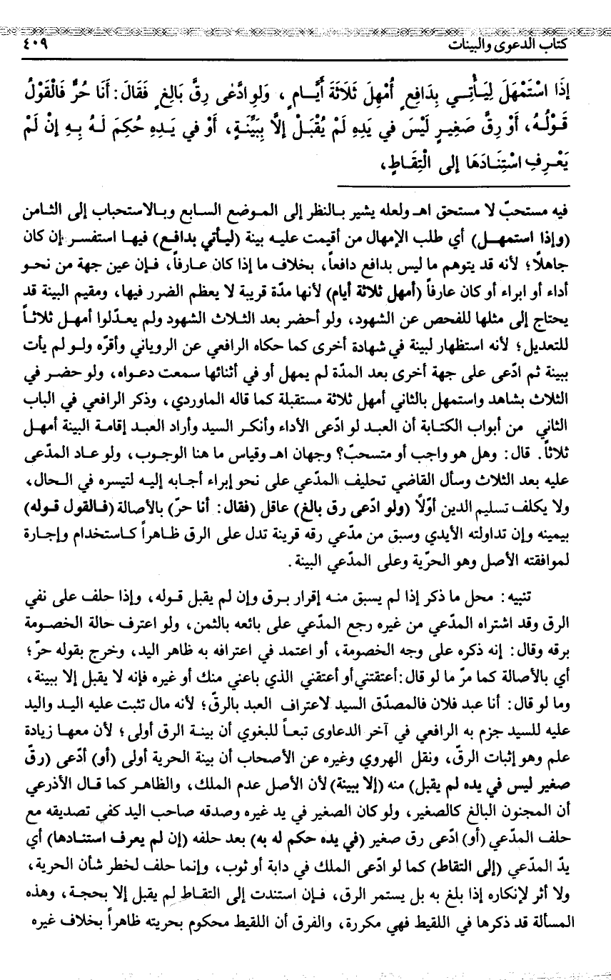 (وَلَوْ) (ادَّعَى رِقَّ بَالِغٍ) عَاقِلٍ (فَقَالَ: أَنَا حُرٌّ) بِالْأَصَالَةِ (فَالْقَوْلُ قَوْلُهُ) بِيَمِينِهِ وَإِنْ تَدَاوَلَتْهُ الْأَيْدِي وَسَبَقَ مِنْ مُدَّعِي رِقَّهُ قَرِينَةٌ تَدُلُّ عَلَى الرِّقِّ ظَاهِرًا كَاسْتِخْدَامٍ وَإِجَارَةٍ لِمُوَافَقَتِهِ الْأَصْلَ وَهُوَ الْحُرِّيَّةُ وَعَلَى الْمُدَّعِي الْبَيِّنَةُ.