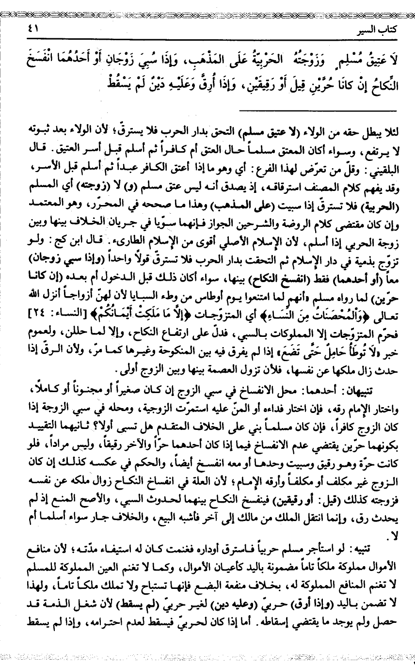 (وَ) لَا (زَوْجَتُهُ) أَيْ الْمُسْلِمِ (الْحَرْبِيَّةُ) فَلَا تَسْتَرِقُّ إذَا سُبِيَتْ (عَلَى الْمَذْهَبِ) وَهَذَا مَا صَحَّحَهُ فِي الْمُحَرَّرِ، وَهُوَ الْمُعْتَمَدُ وَإِنْ كَانَ مُقْتَضَى كَلَامِ الرَّوْضَةِ وَالشَّرْحَيْنِ الْجَوَازَ فَإِنَّهُمَا سَوِيًّا فِي جَرَيَانِ الْخِلَافِ بَيْنَهَا وَبَيْنَ زَوْجَةِ الْحَرْبِيِّ إذَا أَسْلَمَ؛ لِأَنَّ الْإِسْلَامَ الْأَصْلِيَّ أَقْوَى مِنْ الْإِسْلَامِ الطَّارِئِ. قَالَ: ابْنُ كَجٍّ: وَلَوْ تَزَوَّجَ بِذِمِّيَّةٍ فِي دَارِ الْإِسْلَامِ ثُمَّ الْتَحَقَتْ بِدَارِ الْحَرْبِ فَلَا تَسْتَرِقُّ قَوْلًا وَاحِدًا (وَإِذَا سُبِيَ زَوْجَانِ) مَعًا (أَوْ أَحَدُهُمَا) فَقَطْ (انْفَسَخَ النِّكَاحُ) بَيْنَهَا، سَوَاءٌ أَكَانَ ذَلِكَ قَبْلَ الدُّخُولِ أَمْ بَعْدَهُ (إنْ كَانَا حُرَّيْنِ) لَمَّا رَوَاهُ مُسْلِمٌ أَنَّهُمْ لَمَّا امْتَنَعُوا يَوْمَ أَوْطَاسٍ مِنْ وَطْءِ السَّبَايَا؛ لِأَنَّ لَهُنَّ أَزَوْجًا أَنْزَلَ اللَّهُ تَعَالَى {وَالْمُحْصَنَاتُ مِنَ النِّسَاءِ} [النساء: 24] أَيْ الْمُتَزَوِّجَاتُ {إِلا مَا مَلَكَتْ أَيْمَانُكُمْ} [النساء: 24] فَحَرَّمَ الْمُتَزَوِّجَاتِ إلَّا الْمَمْلُوكَاتِ بِالسَّبْيِ، فَدَلَّ عَلَى ارْتِفَاعِ النِّكَاحِ، وَإِلَّا لَمَا حَلَلْنَ، وَلِعُمُومِ خَبَرِ «لَا تُوطَأُ حَامِلٌ حَتَّى تَضَعَ» إذَا لَمْ يُفَرِّقْ فِيهِ بَيْنَ الْمَنْكُوحَةِ وَغَيْرِهَا كَمَا مَرَّ، وَلِأَنَّ الرِّقَّ إذَا حَدَثَ زَالَ مِلْكُهَا عَنْ نَفْسِهَا، فَلَأَنْ تَزُولَ الْعِصْمَةُ بَيْنَهَا وَبَيْنَ الزَّوْجِ أَوْلَى.