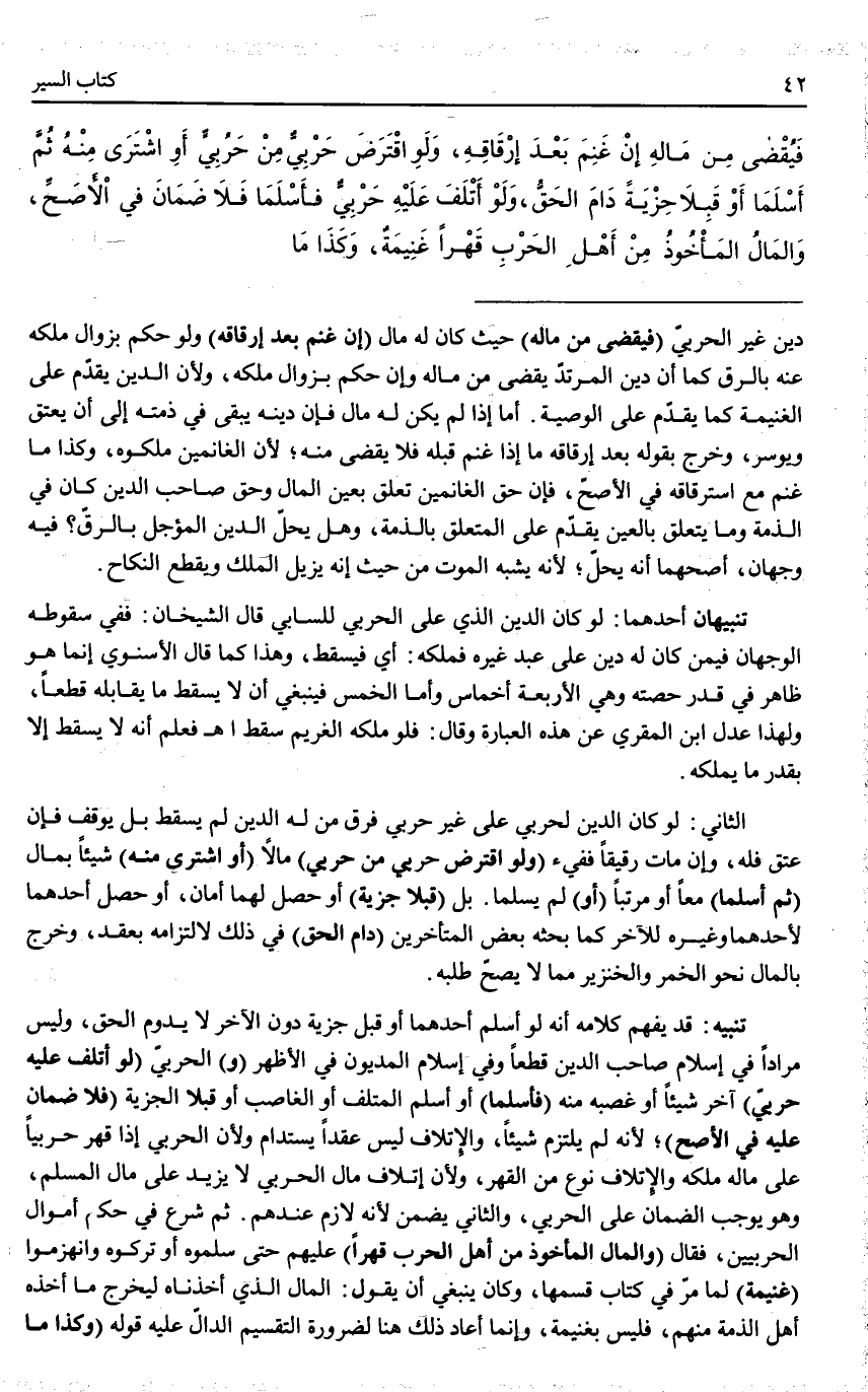 (وَلَوْ اقْتَرَضَ حَرْبِيٌّ مِنْ حَرْبِيٍّ) مَالًا (أَوْ اشْتَرَى مِنْهُ) شَيْئًا بِمَالٍ (ثُمَّ أَسْلَمَا) مَعًا أَوْ مُرَتَّبًا (أَوْ) لَمْ يُسْلِمَا. بَلْ (قَبِلَا جِزْيَةً) أَوْ حَصَل لَهُمَا أَمَانٌ، أَوْ حَصَلَ أَحَدُهُمَا لِأَحَدِهِمَا وَغَيْرُهُ لِلْآخَرِ كَمَا بَحَثَهُ بَعْضُ الْمُتَأَخِّرِينَ (دَامَ الْحَقُّ) فِي ذَلِكَ لِالْتِزَامِهِ بِعَقْدٍ، وَخَرَجَ بِالْمَالِ نَحْو الْخَمْرِ وَالْخِنْزِيرِ مِمَّا لَا يَصِحُّ طَلَبُهُ. تَنْبِيهٌ: قَدْ يُفْهِمُ كَلَامُهُ أَنَّهُ لَوْ أَسْلَمَ أَحَدُهُمَا أَوْ قَبِلَ جِزْيَةً دُونَ الْآخَرِ لَا يَدُومُ الْحَقُّ، وَلَيْسَ مُرَادًا فِي إسْلَامِ صَاحِبِ الدَّيْنِ قَطْعًا وَفِي إسْلَامِ الْمَدْيُونِ فِي الْأَظْهَرِ.