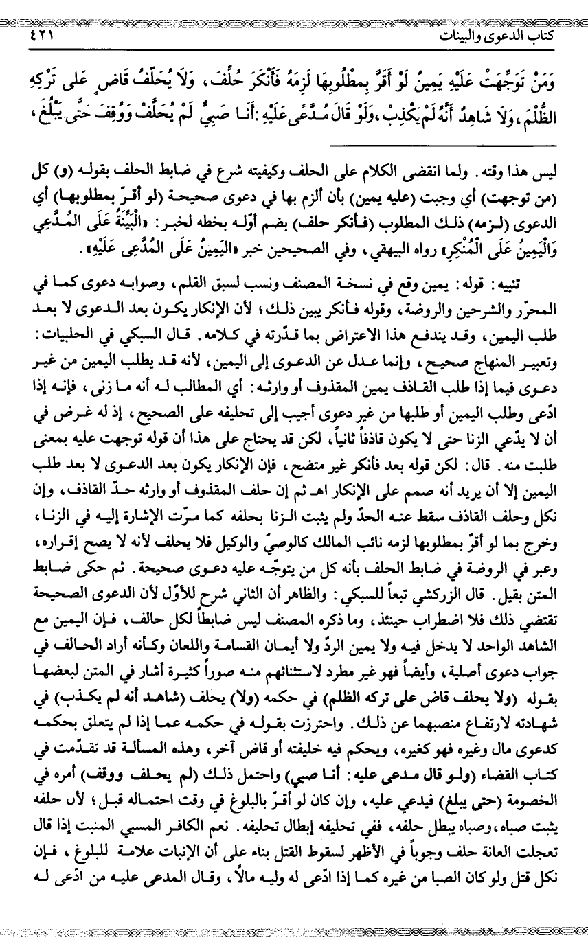 وَلَمَّا انْقَضَى الْكَلَامُ عَلَى الْحَلِفِ وَكَيْفِيَّتِهِ شَرَعَ فِي ضَابِطِ الْحَلِفِ بِقَوْلِهِ (وَ) كُلُّ (مَنْ تَوَجَّهَتْ) أَيْ وَجَبَتْ (عَلَيْهِ يَمِينٌ) بِأَنْ أُلْزِمَ بِهَا فِي دَعْوَى صَحِيحَةٍ (لَوْ أَقَرَّ بِمَطْلُوبِهَا) أَيْ الدَّعْوَى (لَزِمَهُ) ذَلِكَ الْمَطْلُوبُ (فَأَنْكَرَ حُلِّفَ) بِضَمِّ أَوَّلِهِ بِخَطِّهِ لِخَبَرِ: «الْبَيِّنَةُ عَلَى الْمُدَّعِي وَالْيَمِينُ عَلَى الْمُنْكِرِ» رَوَاهُ الْبَيْهَقِيُّ.